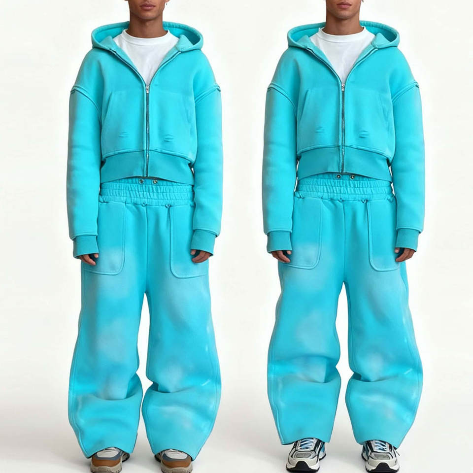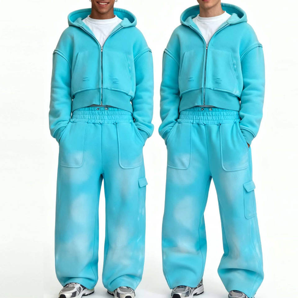 ชุดเสื้อฮู้ดดี้ทรงบานพิมพ์ลายแบบกำหนดเองและกางเกงขายาวทรงหลวม ผ้าฝ้ายฟอกสีสไตล์สตรีทแวร์สำหรับผู้ชาย