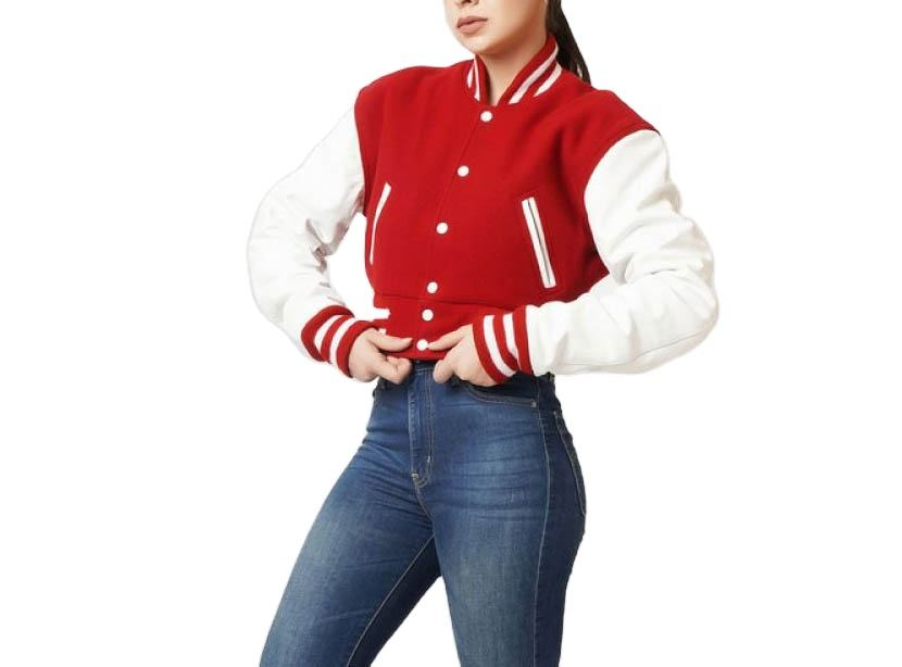 เสื้อแจ็คเก็ตวาร์ซิตี้ผ้าวูลพิมพ์ลายแบบสั่งตัดพิเศษ สำหรับผู้หญิง สีแดงขาว สไตล์เบสบอล กระดุมเดี่ยว ผ้าฝ้าย เป็นมิตรกับสิ่งแวดล้อม มีบริการ OEM