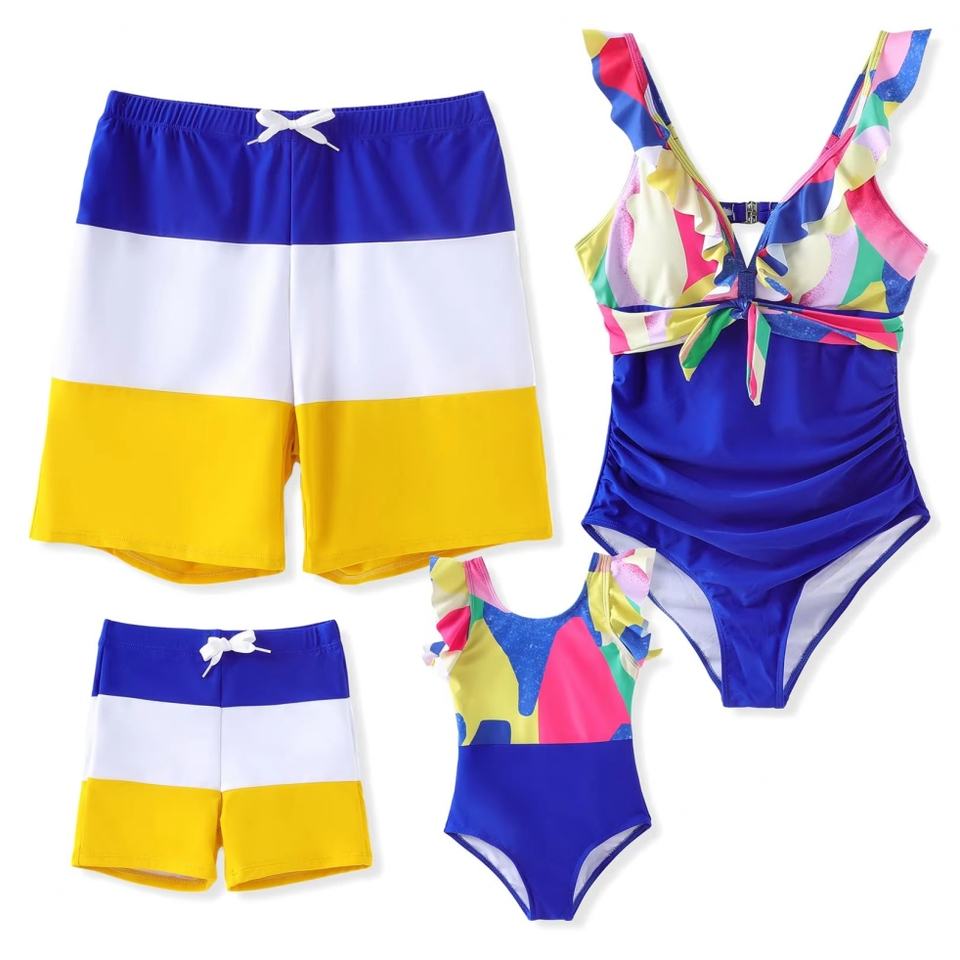 ชุดว่ายน้ำวันพีซแบบคัลเลอร์บล็อกสั่งตัดได้ และชุดว่ายน้ำ 4 ชิ้นสำหรับผู้หญิง ชุดชายหาดสำหรับครอบครัว และบิกินี่สำหรับผู้หญิง