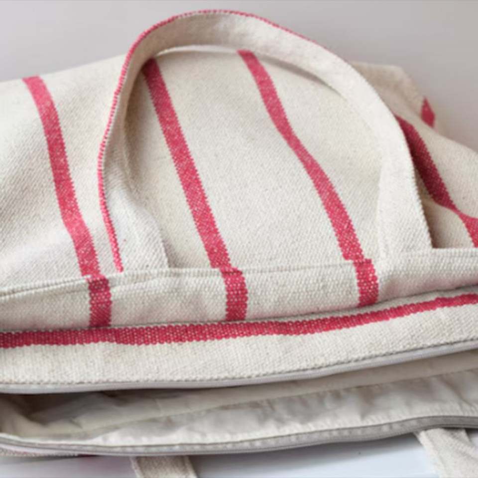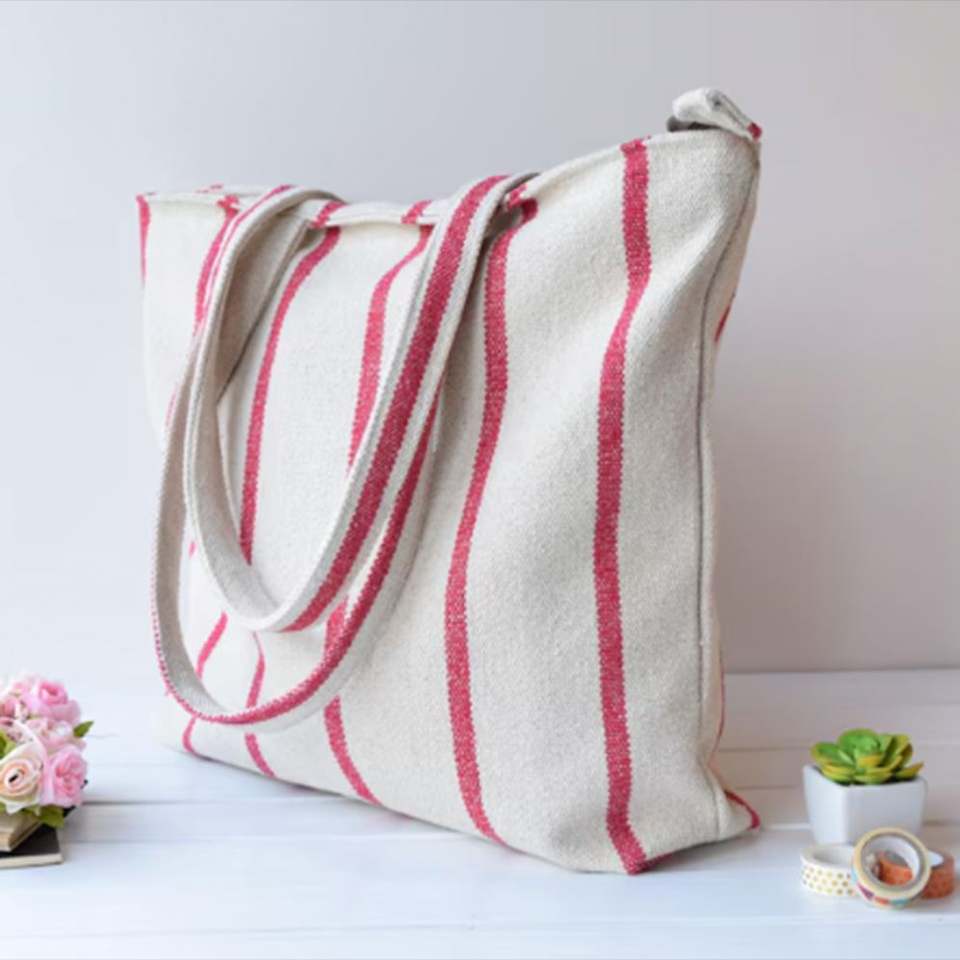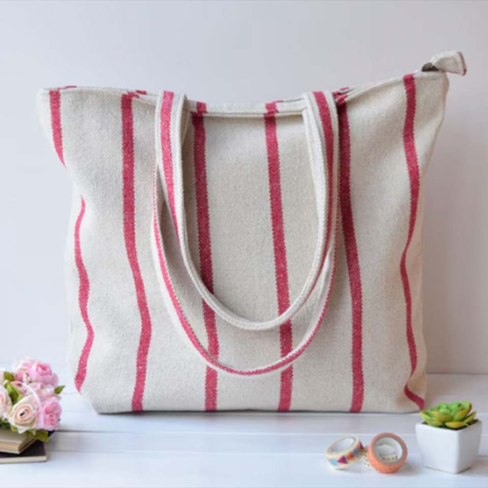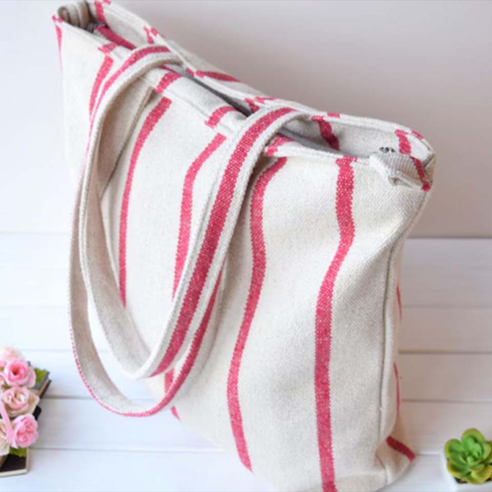 กระเป๋าผ้าแคนวาสลายทางแบบกำหนดเอง DIY ขนาดใหญ่ มีซิปสะพายไหล่ พกพาสะดวก สำหรับฤดูหนาว ลำลอง ผู้หญิง เดินทาง ฤดูร้อน ชายหาด