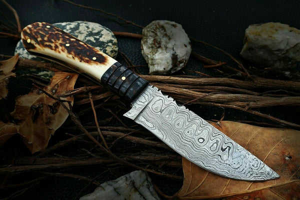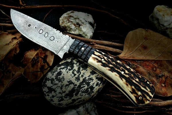 มีดล่าสัตว์เหล็กดามัสกัสแบบกำหนดเอง DIY OEM ด้ามเขาสัตว์ ใบมีดตรงเต็มด้าม มีดเอาตัวรอดกลางแจ้ง มีดตั้งแคมป์