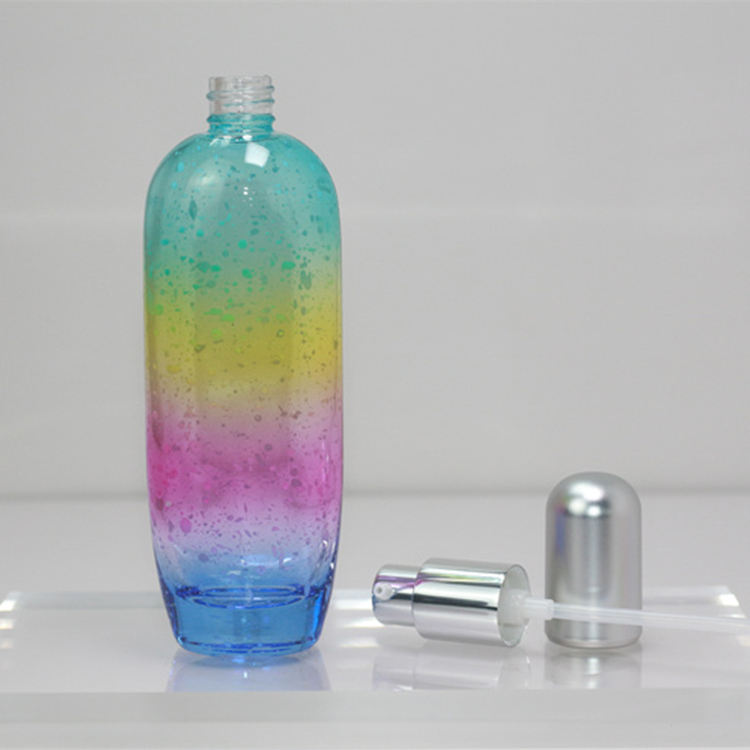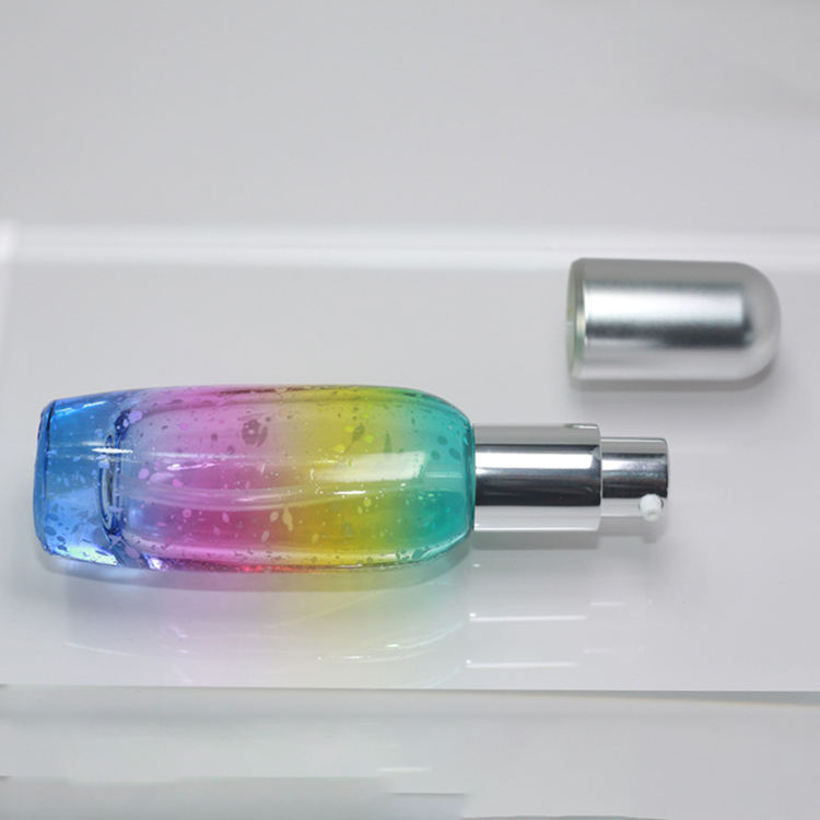 โรงงานผลิตขวดเครื่องสำอางแก้วแบบอิมัลชั่นหลากสีไล่เฉด ขนาด 30 มล. 50 มล. 100 มล. พร้อมหัวปั๊มอะลูมิเนียม จำหน่ายโดยตรง