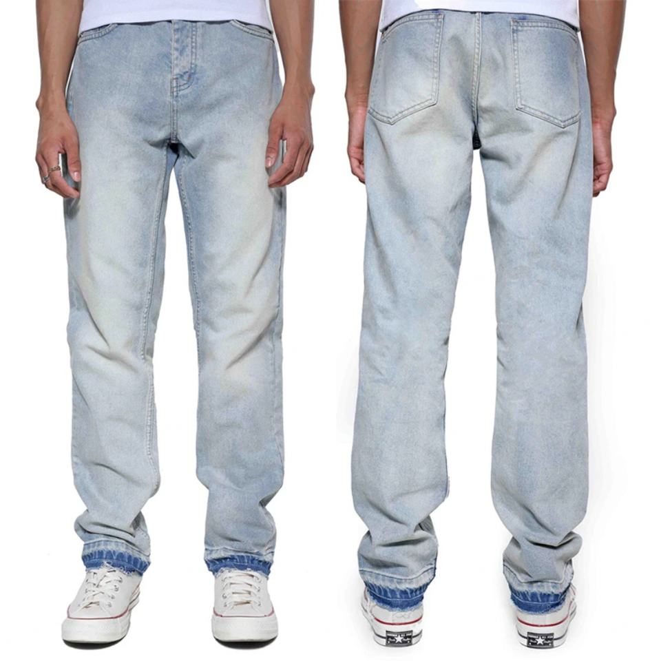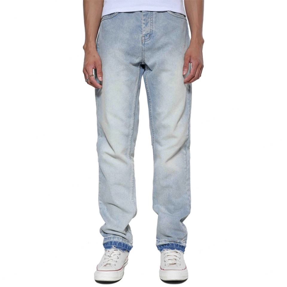 กางเกงยีนส์เดนิมสั่งทำพิเศษสำหรับผู้ชาย ผ้าฝ้ายเดนิม 100% กางเกงยีนส์ทรงตรงสีน้ำเงิน ขอบดิบ