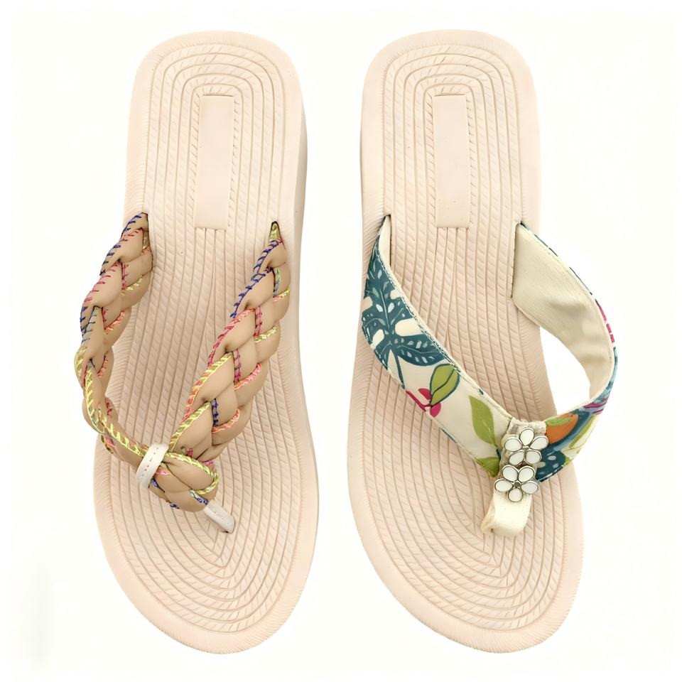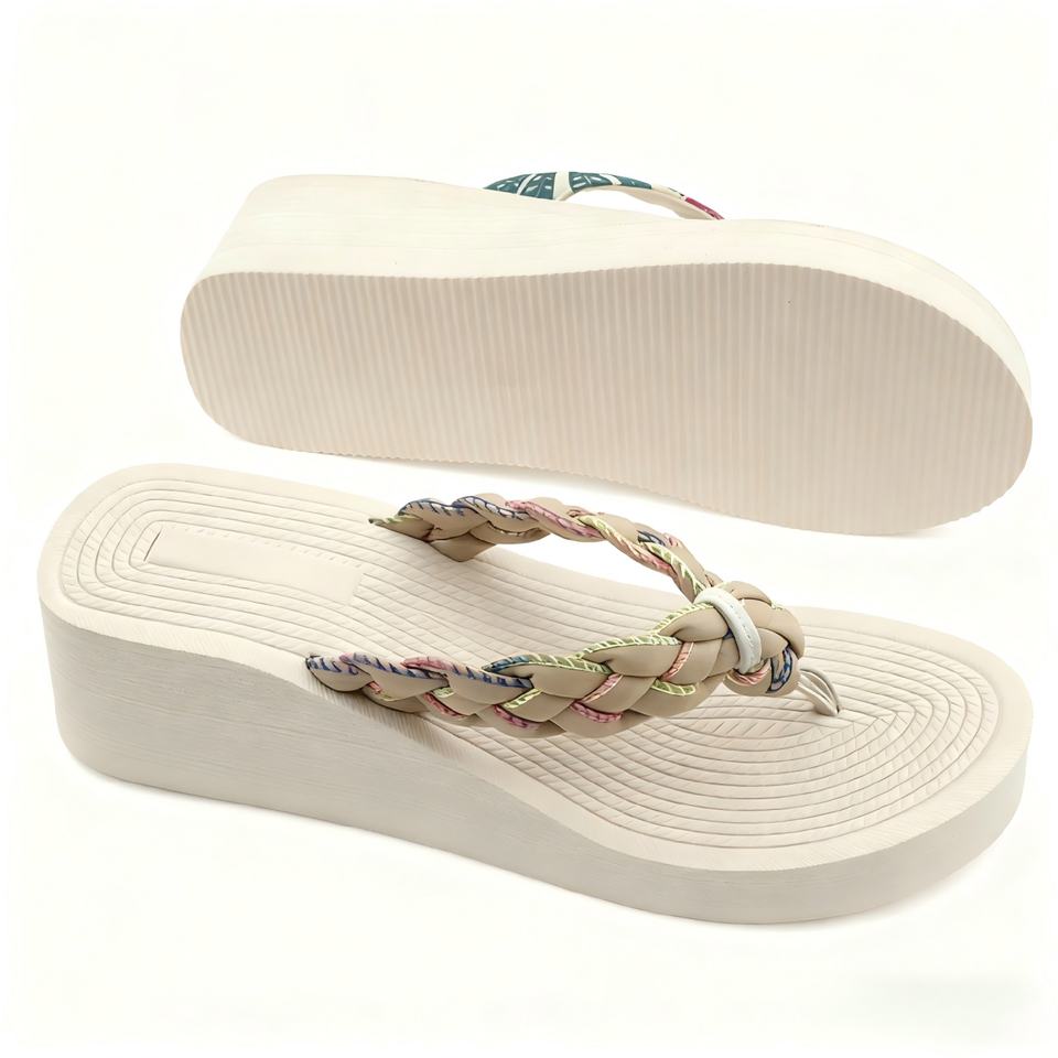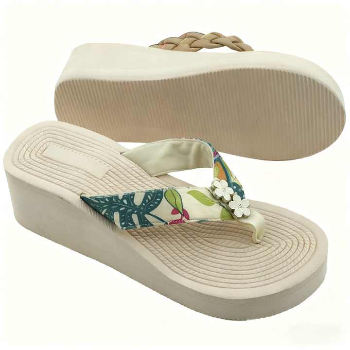 รองเท้าแตะส้นสูงแบบแพลตฟอร์มสีเบจ ดีไซน์ตามสั่ง สายรัดผ้าผสมลายดอกไม้ รองเท้าแตะชายหาด สไตล์ลำลองสำหรับฤดูร้อน รับผลิตแบบ OEM ODM