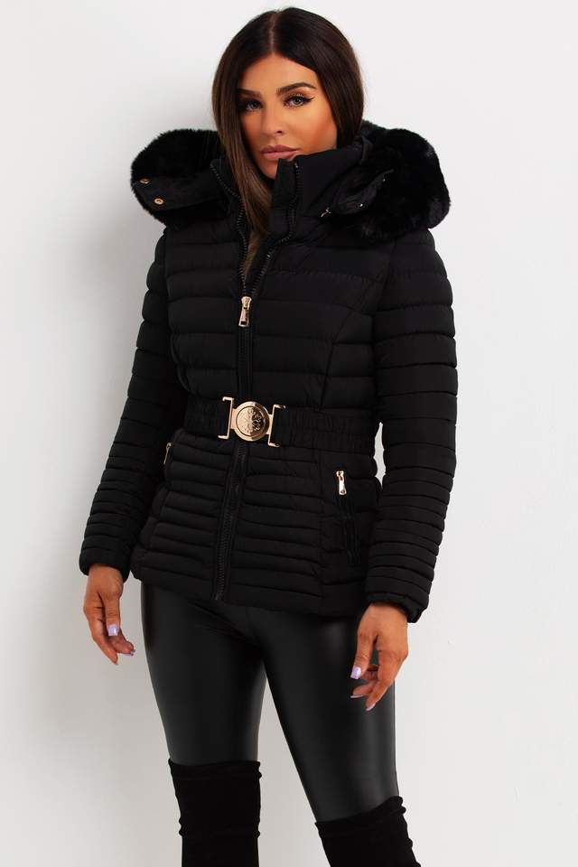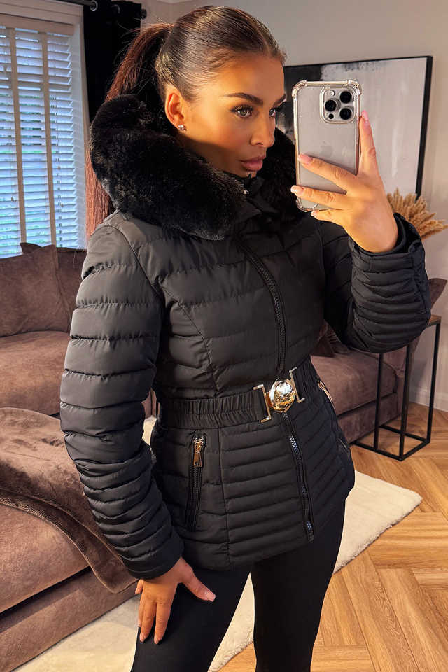 แจ็กเก็ตขนเป็ดสีดำมีฮู้ดสำหรับผู้หญิงมีซิปมีเข็มขัดสีทองแจ็กเก็ตขนเป็ดสำหรับฤดูหนาวดีไซน์ตามสั่ง