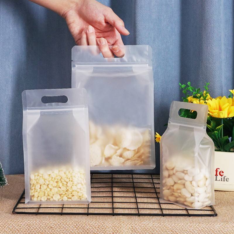 ถุงบรรจุภัณฑ์ข้าวแบบใส PE แบบกำหนดเองได้ ใช้ซ้ำได้ ก้นสี่เหลี่ยม พร้อมซิปล็อคและพิมพ์กราเวียร์ สำหรับบรรจุอาหารแห้ง เกลือ แป้ง