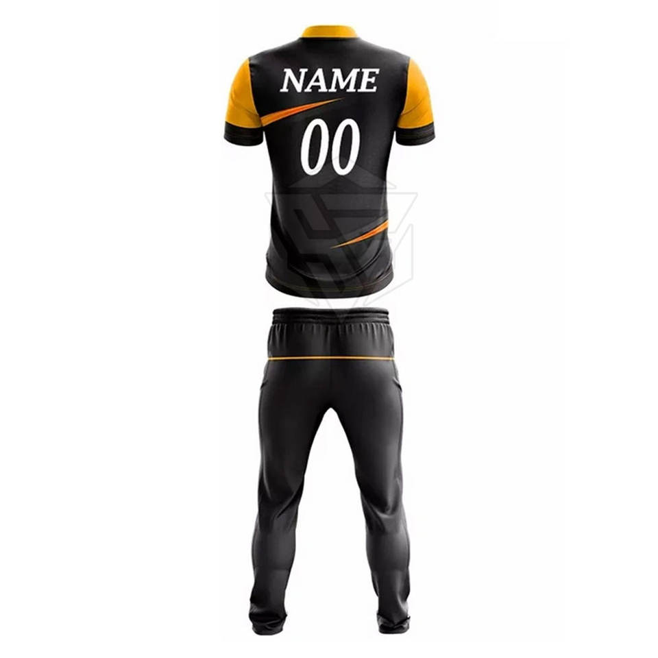 ชุดกีฬาสำหรับเล่นคริกเก็ตชุดเสื้อเจอร์ซีย์และกางเกงขายาวพิมพ์ซับลิเมชันดีไซน์ออกแบบได้ตามต้องการ