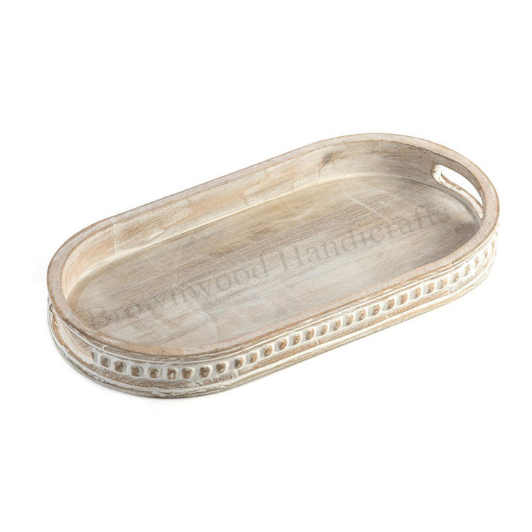 ถาดไม้เสิร์ฟอาหารแกะสลักด้วยมือพร้อมด้ามจับถาดไม้รูปวงรีทรงมะม่วงดีไซน์ตามสั่งจากผู้ผลิตอินเดีย