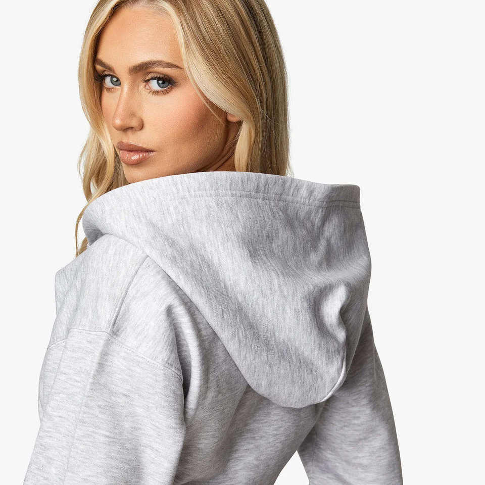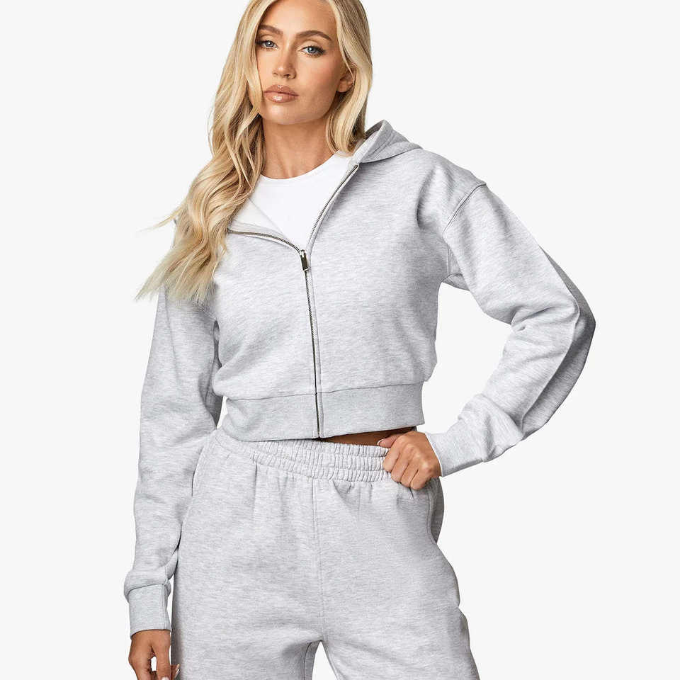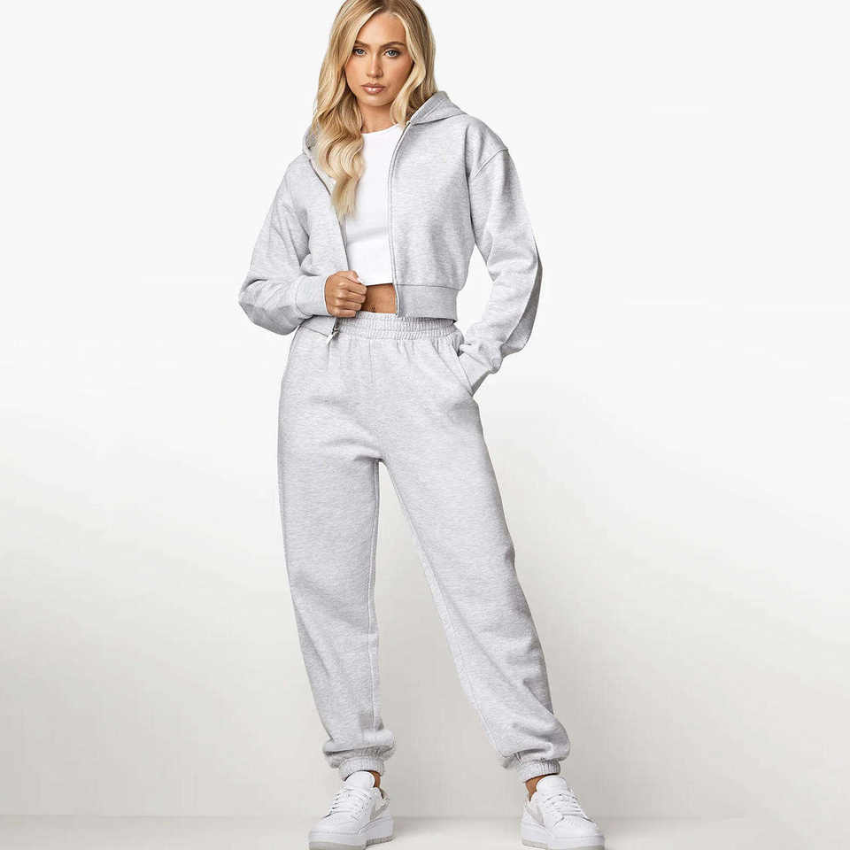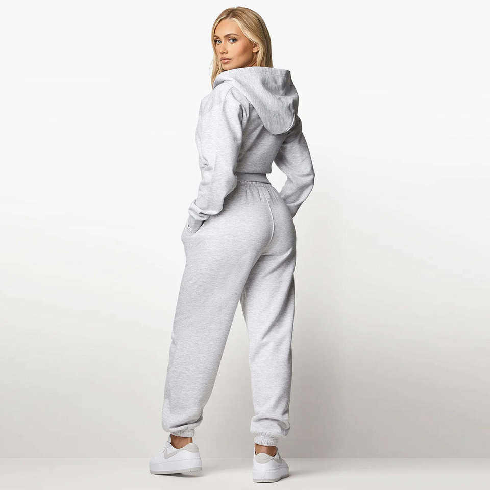 ชุดเซ็ตแทรคสูทผู้หญิงแบบ 2 ชิ้น ดีไซน์โลโก้ตามสั่ง สีสโนว์มาร์ล พร้อมซิป ฮู้ดดี้ระบายอากาศได้ดี และกางเกงจ็อกเกอร์ขายาว เหมาะสำหรับออกกำลังกายและเล่นกีฬา