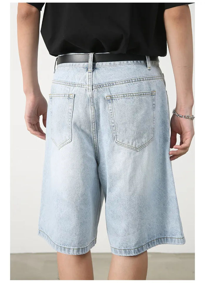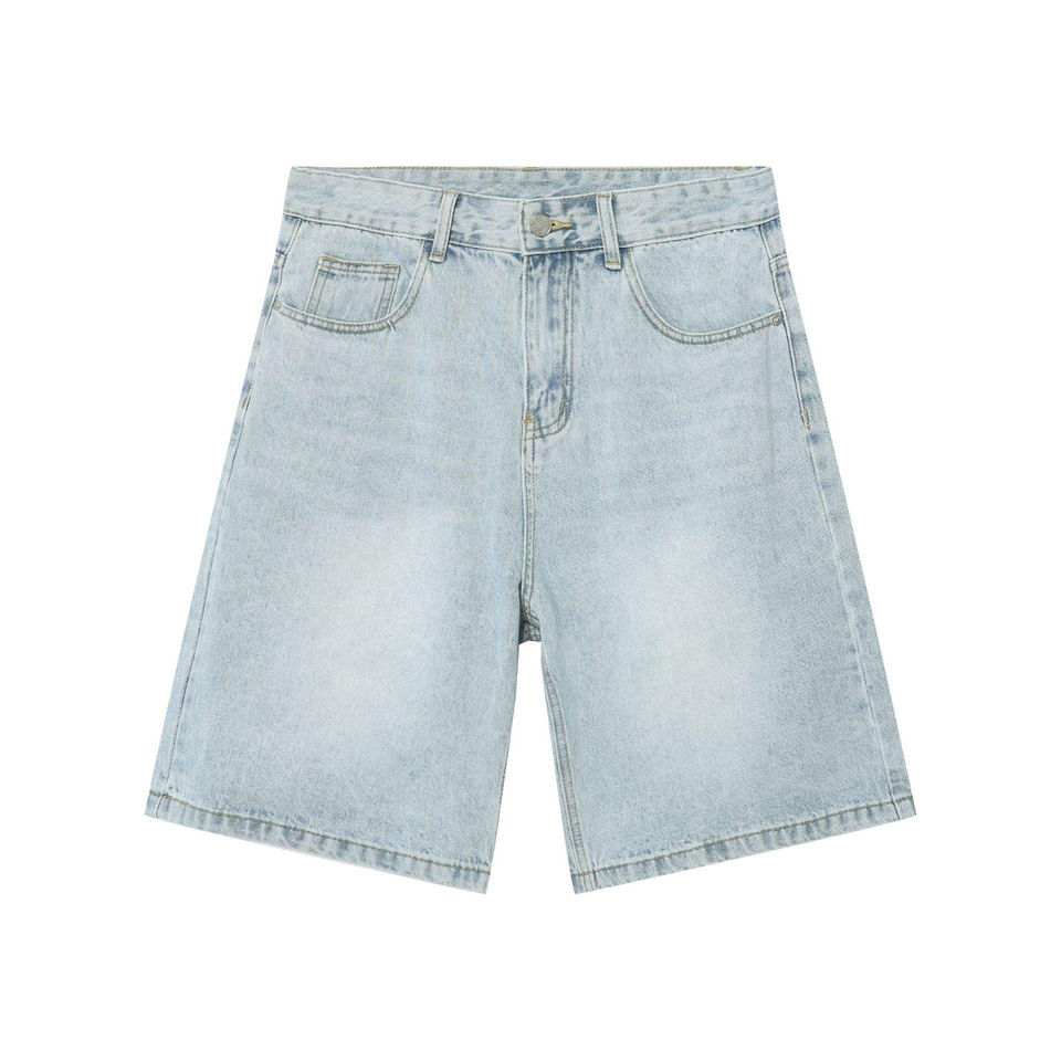 กางเกงขาสั้นผ้ายีนส์แบบลำลองสำหรับผู้ชายกางเกงขาสั้นทรงหลวมหลวมแต่งชายเสื้อเย็บติดพลอยเทียมอัญมณีกางเกงขาสั้นซักเบาออกแบบได้ตามต้องการ