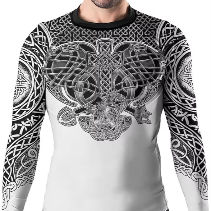 เสื้อรัดกล้ามเนื้อแขนยาวสำหรับผู้ชายแบบสั่งทำพิเศษสำหรับกีฬาบราซิลเลียนยิวยิตสู ผลิตจากโพลีเอสเตอร์ 100% คุณภาพพรีเมียม บริการ OEM พิมพ์ลายด้วยความร้อน