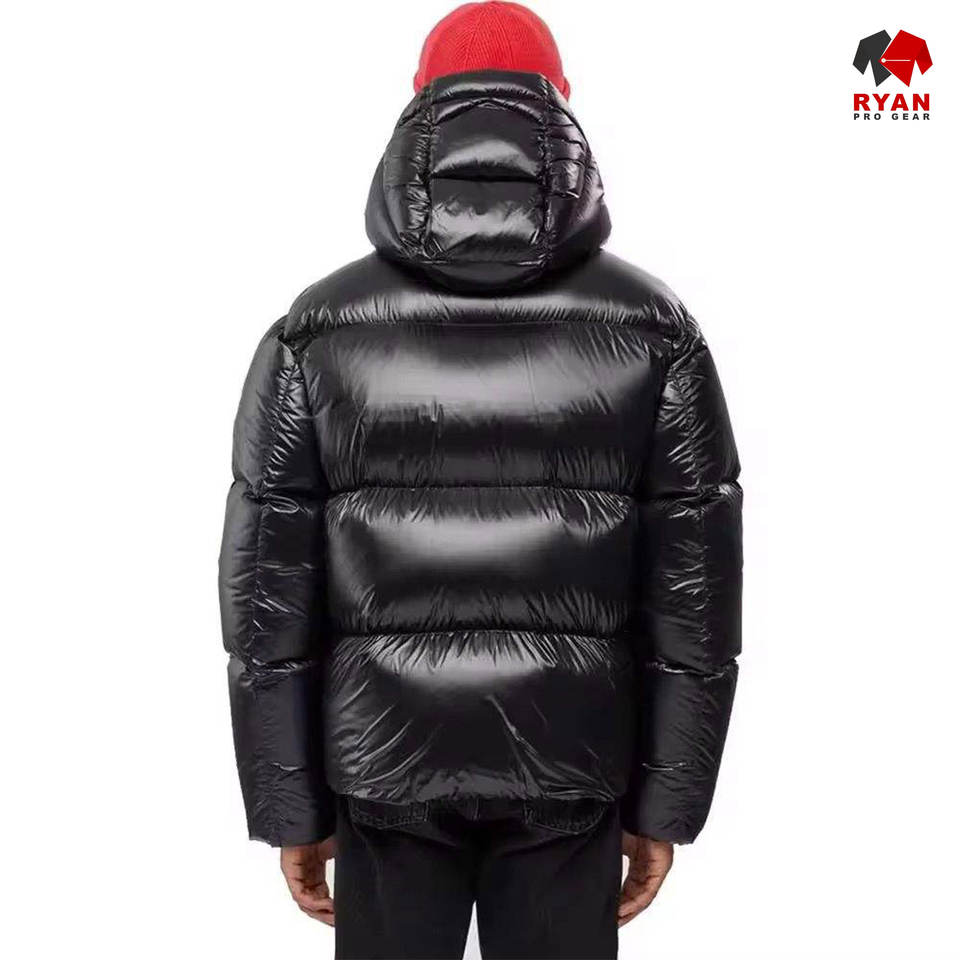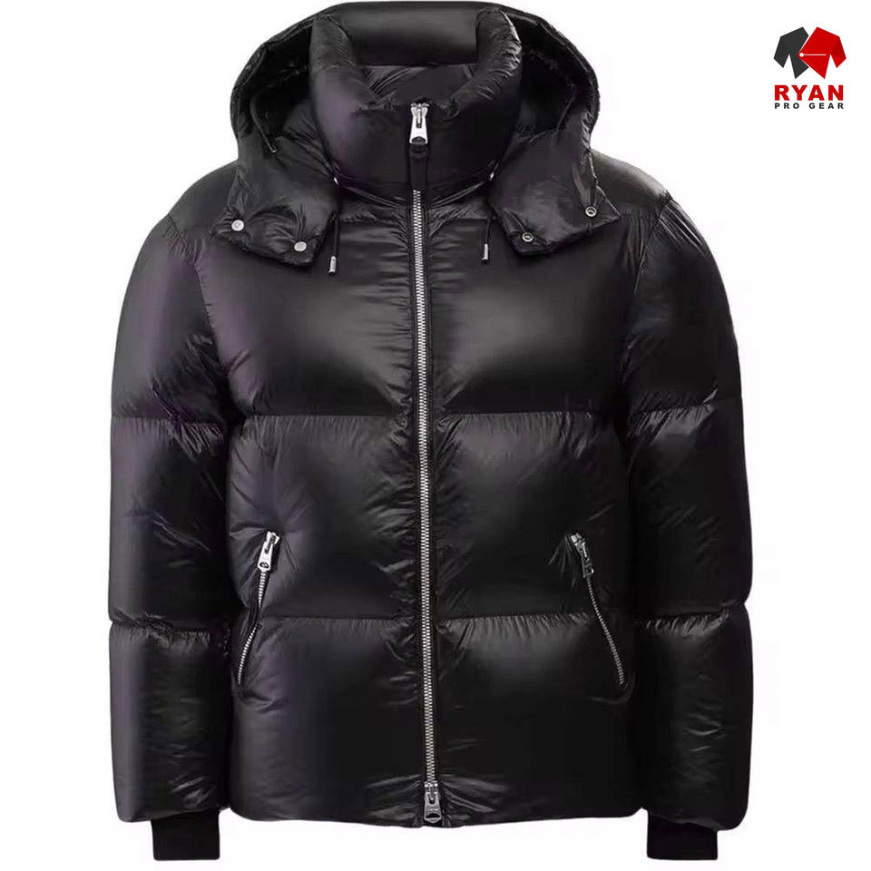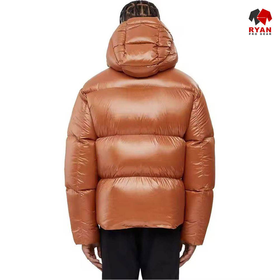 เสื้อแจ็คเก็ตพัฟเฟอร์ผู้ชายแบบกำหนดเองสำหรับฤดูหนาว มีฮู้ด ปิดด้วยซิป โลโก้แบบกำหนดเองด้านหน้า ผ้าระบายอากาศได้ดี ออกแบบตามแบบ OEM