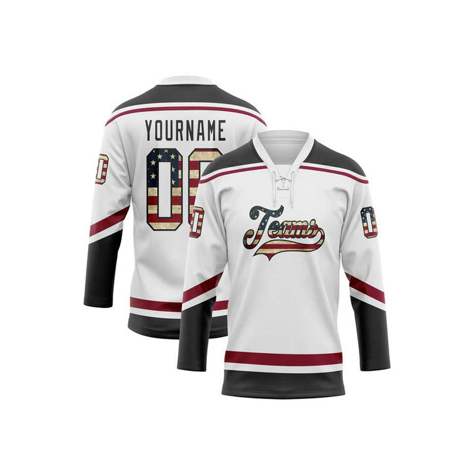 ออกแบบเสื้อฮอกกี้น้ำแข็งสไตล์ใหม่สำหรับผู้ใหญ่ กางเกงแบบซับลิเมชั่นสั่งทำพร้อมชื่อทีม OEM ชุดกีฬาพิมพ์ลายตามสั่ง