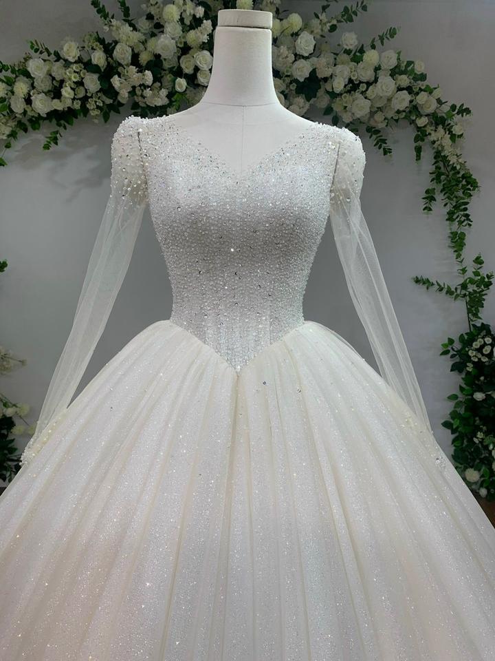 ชุดแต่งงานลูกไม้เปิดไหล่ชุดเจ้าสาวแขนยาวขนาดใหญ่พิเศษออกแบบได้ตามต้องการสำหรับงานแต่งงานในฤดูร้อน