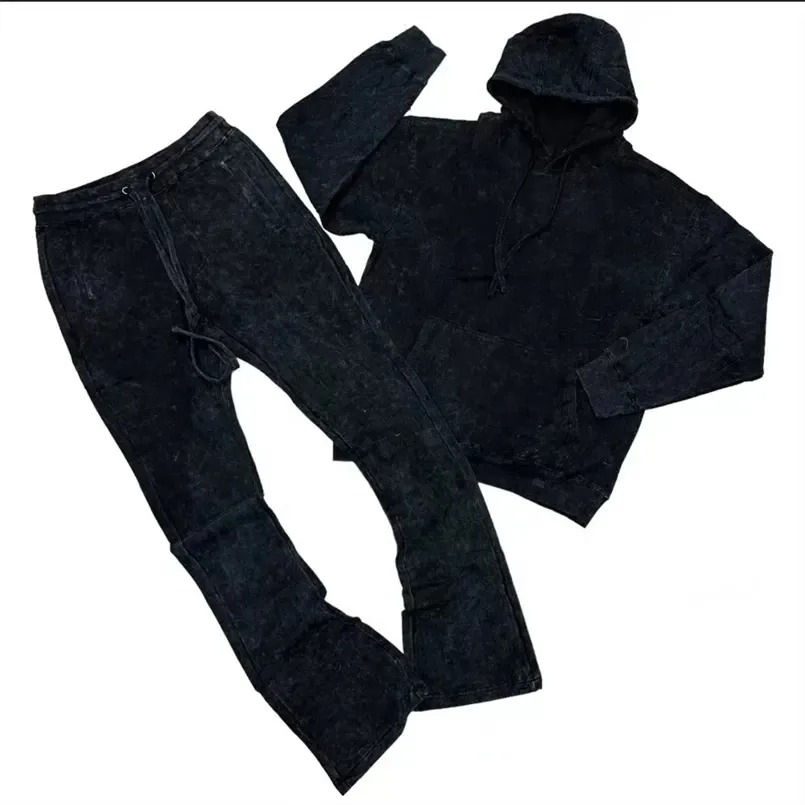 ชุดเซ็ตเสื้อฮู้ดดี้และกางเกงวอร์มขาบานทรงโอเวอร์ไซส์ผ้าฝ้าย 100% ปักลายแบบสั่งทำพิเศษสำหรับผู้ชาย สไตล์สตรีทแวร์