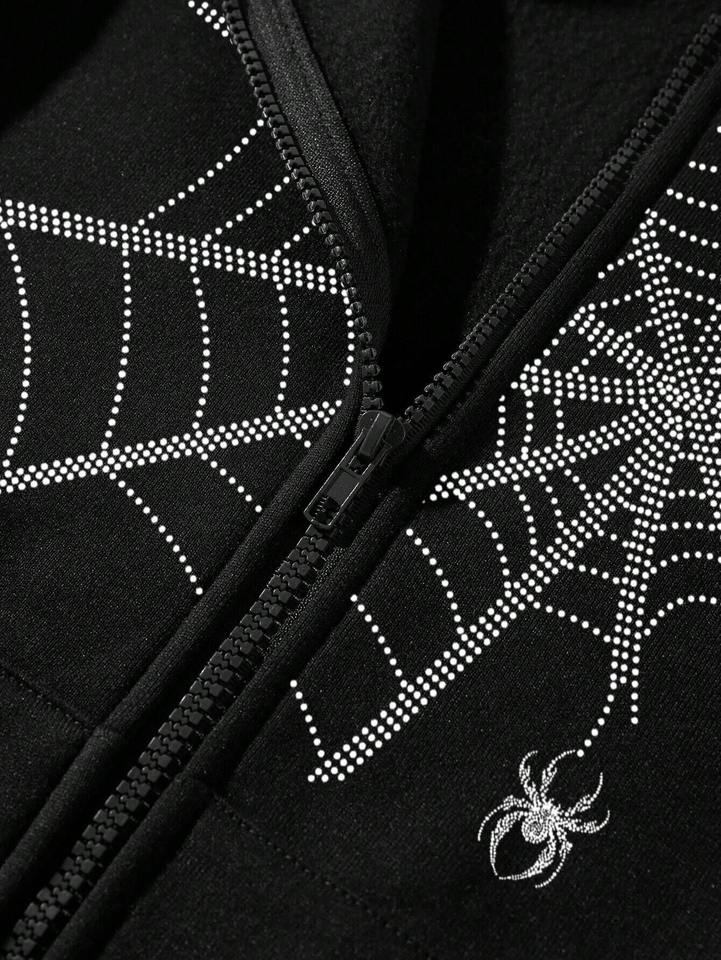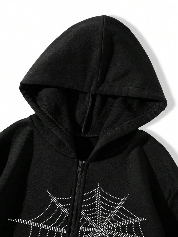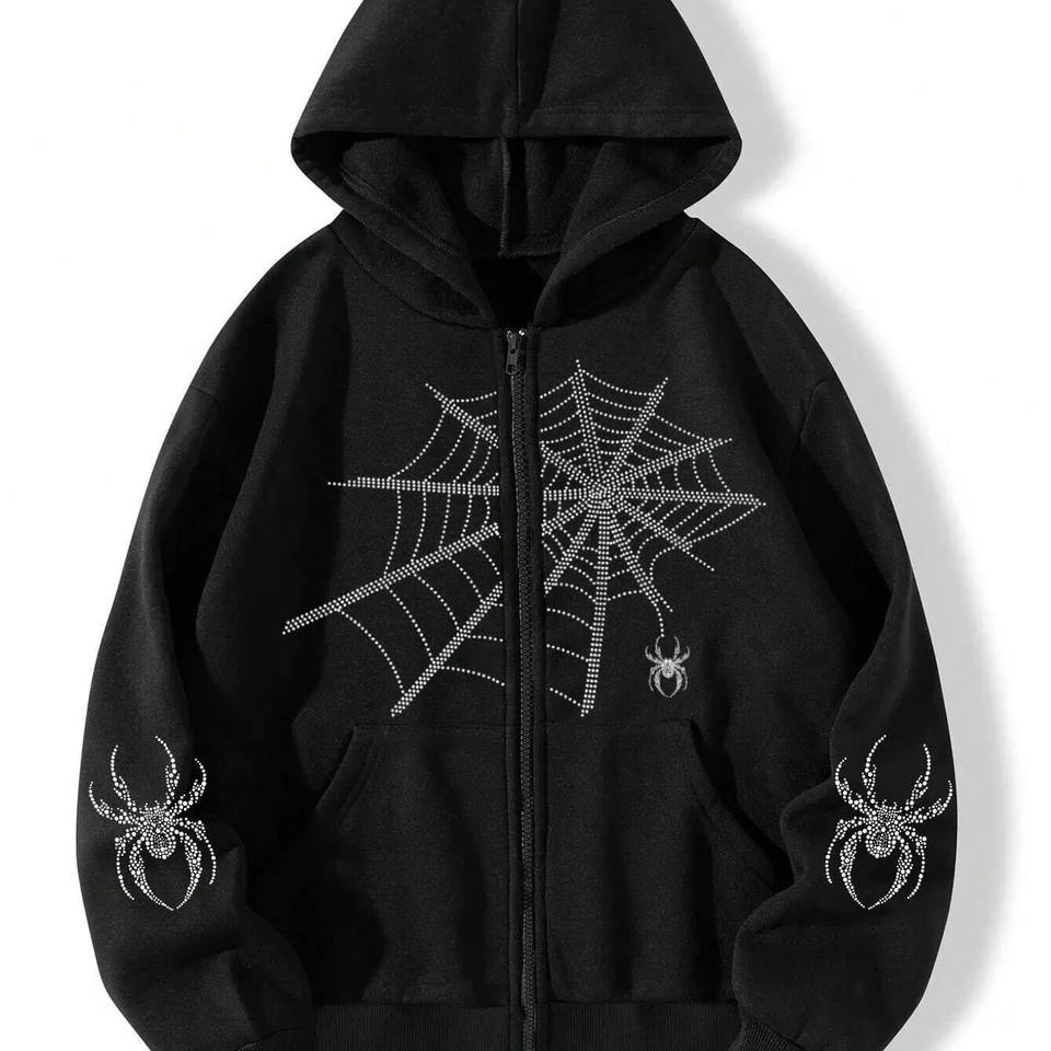 เสื้อฮู้ดลายแมงมุมพลอยเทียมสำหรับผู้ชายผู้หญิงเสื้อสเวตเชิ้ตสไตล์สตรีทแวร์ผ้าคอตตอนผสม320GSM ดีไซน์ตามสั่งมีโลโก้