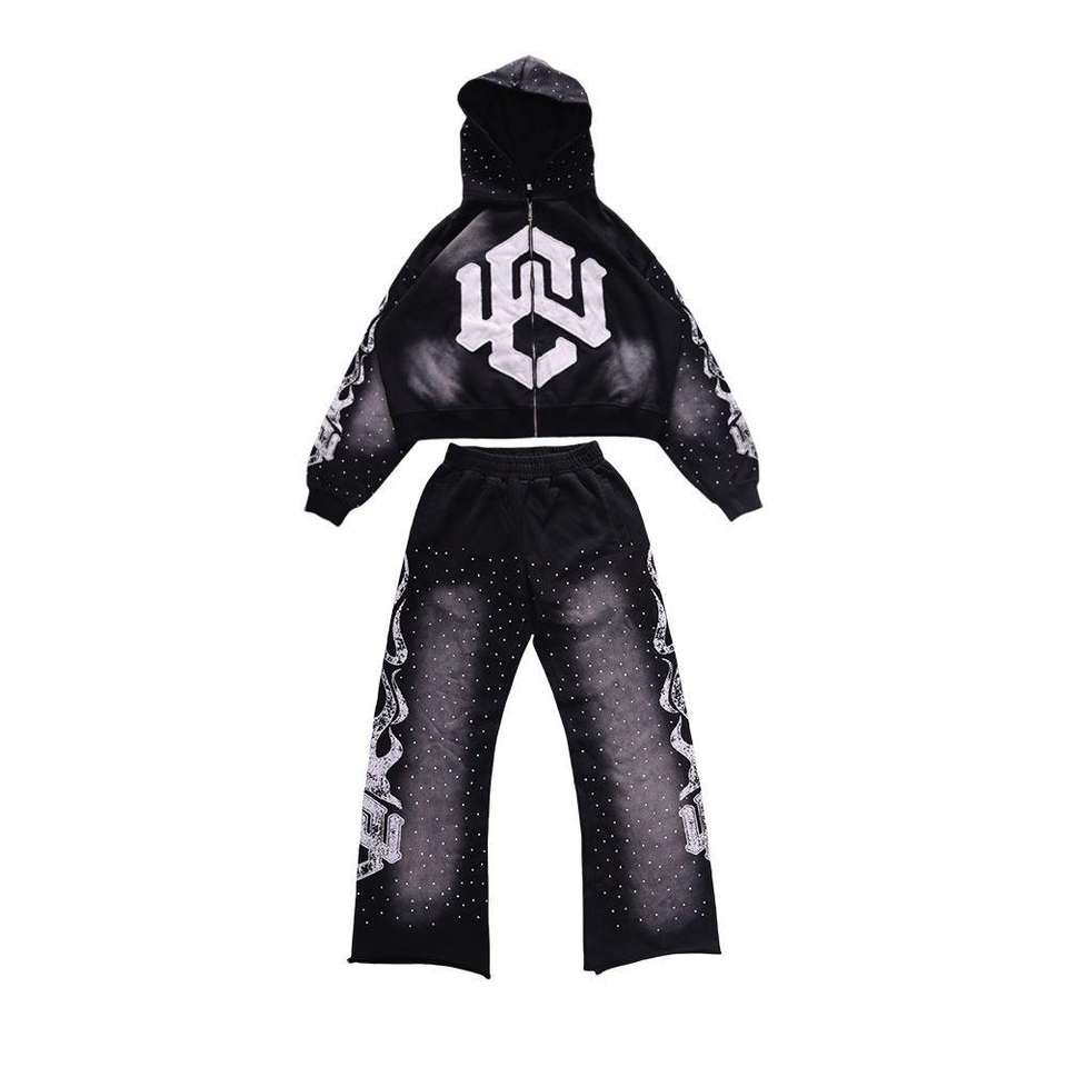 ชุดวอร์มผู้ชายแบบมีฮู้ดและกางเกง ดีไซน์สตรีทแวร์สั่งทำพิเศษ ผ้าฝ้าย 100% ประดับเพชร รุ่นใหม่ล่าสุดปี 2026 คุณภาพพรีเมียม สวมใส่สบาย