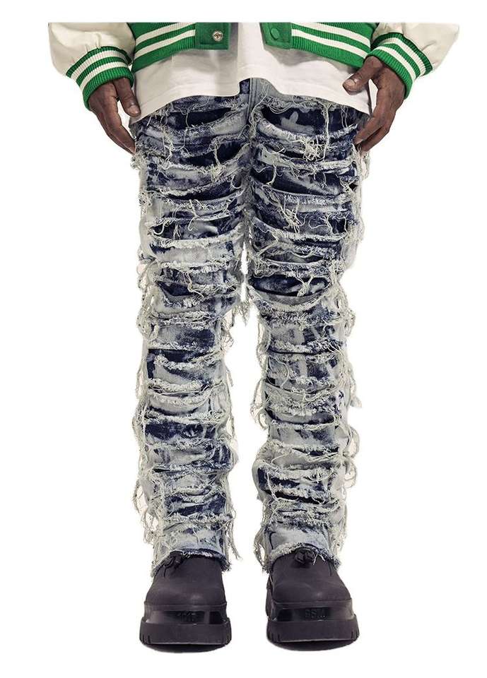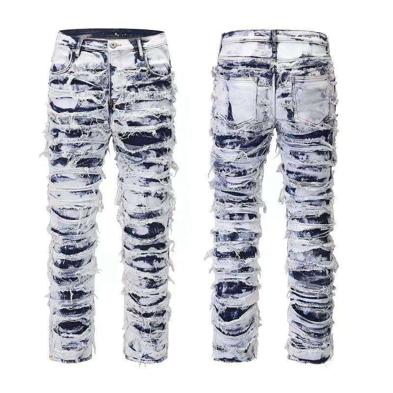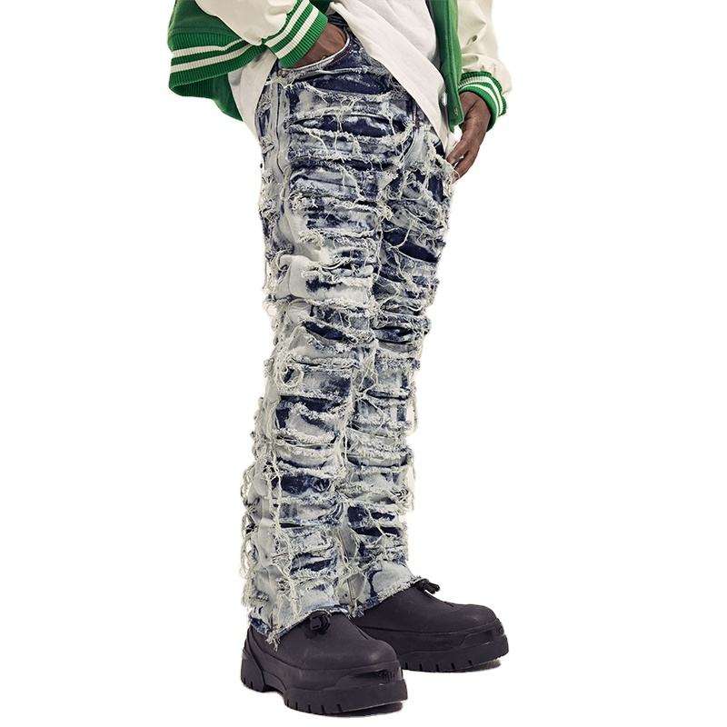 กางเกงยีนส์ผู้ชายสไตล์วินเทจแบบสั่งทำพิเศษ ทรงสกินนี่ขาบาน แต่งขาดและทำลายแบบดิสเทรส