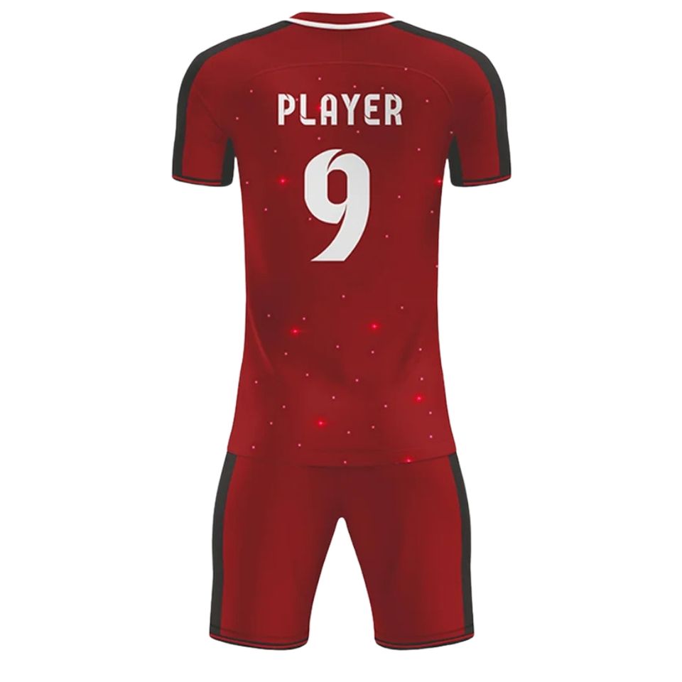 เสื้อฟุตบอลโพลีเอสเตอร์ 100% พิมพ์ลายแบบซับลิเมชั่น ออกแบบเองได้ คอกลม แขนสั้น ชื่อ/หมายเลขทีมตามสั่ง แห้งเร็ว