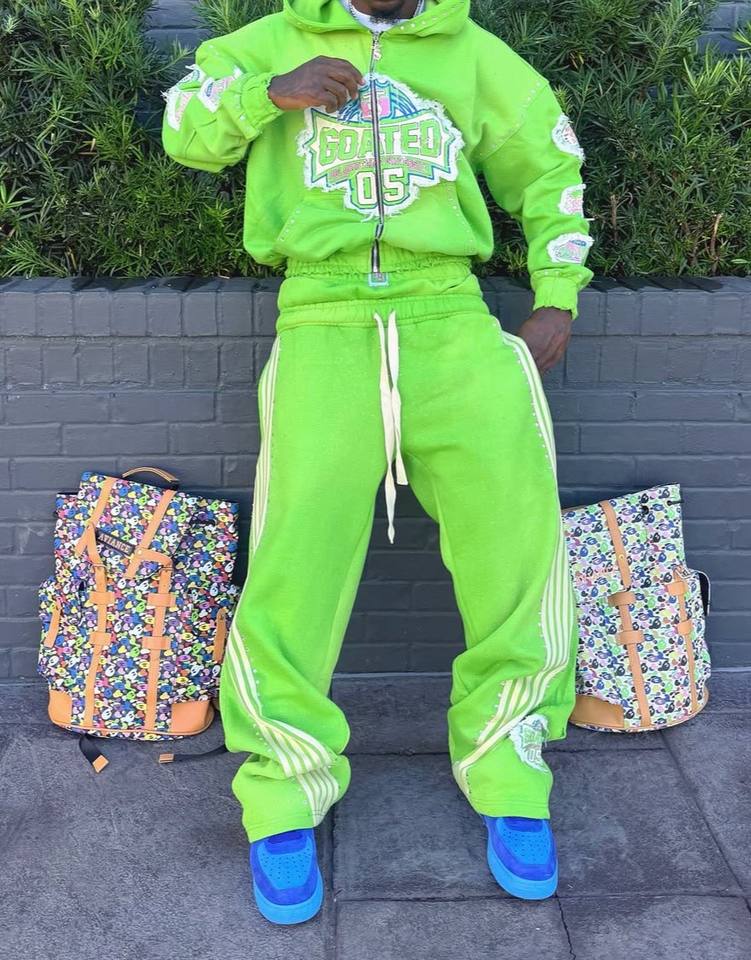 ชุดแทร็คสูทแบบเรียงซ้อนกันสำหรับชายและหญิงชุดเสื้อมีฮู้ดและกางเกงวอร์มทรงหลวมปักลายด้วยแสงแดดออกแบบได้ตามต้องการ