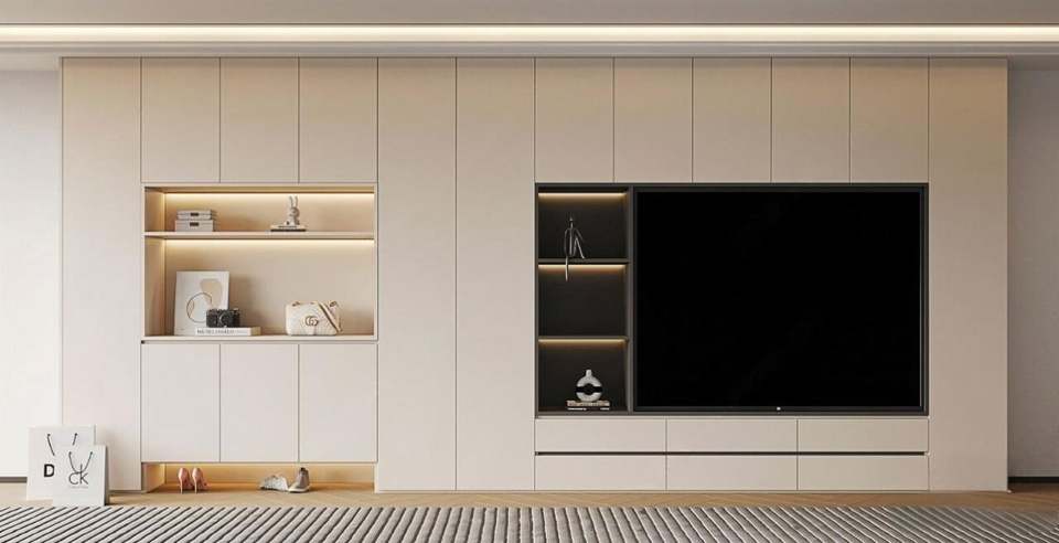 ตู้วางทีวีติดผนังแบบอัจฉริยะเฟอร์นิเจอร์ห้องนั่งเล่นสีเทาทันสมัย
