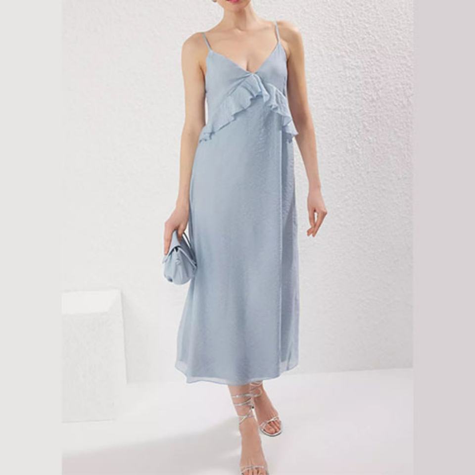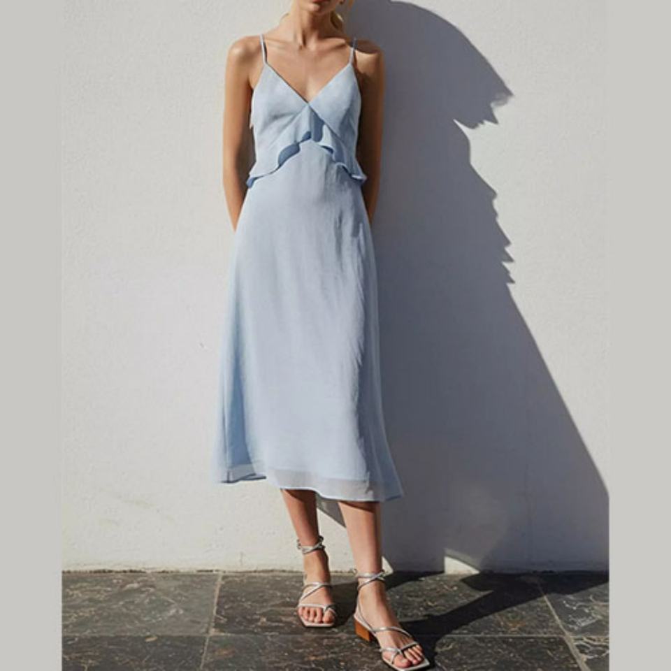 ชุดเดรสยาวปานกลางแบบเรียบหรู ดีไซน์เองได้ ขายส่ง ราคาถูก สำหรับผู้หญิง คอวี แต่งระบาย แขนกุด