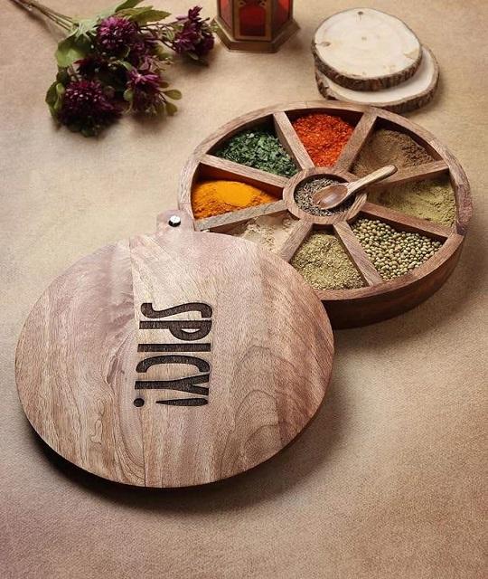 กล่องไม้ใส่เครื่องเทศเครื่องปรุงสมุนไพรมาซาลาพร้อมช้อนผู้ผลิตในโรงงานอินเดียดีไซน์ตามสั่ง
