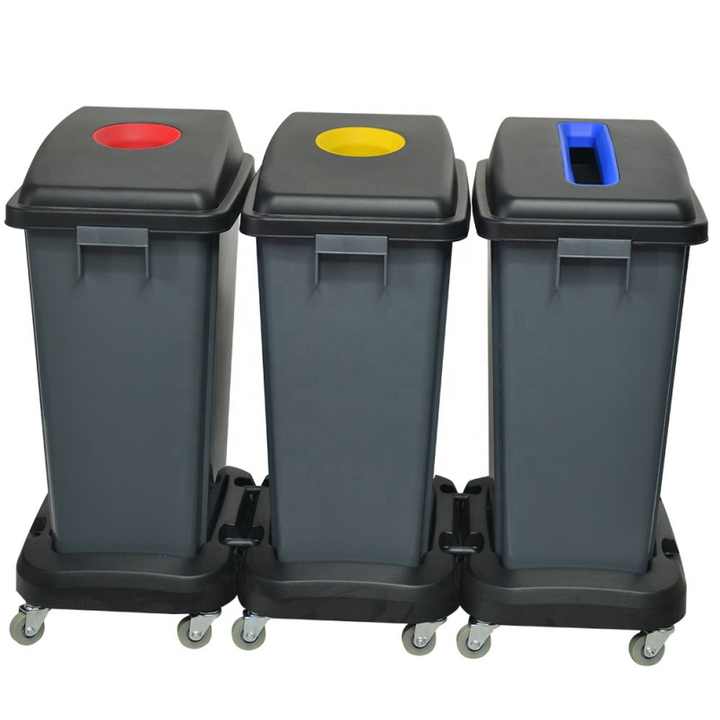 ที่เก็บของทำจากวัสดุ PP ดีไซน์แบบกำหนดเอง60L สำหรับโฆษณากลางแจ้งกล่องรีไซเคิล3ช่องเป็นมิตรกับสิ่งแวดล้อมฝาครอบแบบเปิดด้านบน
