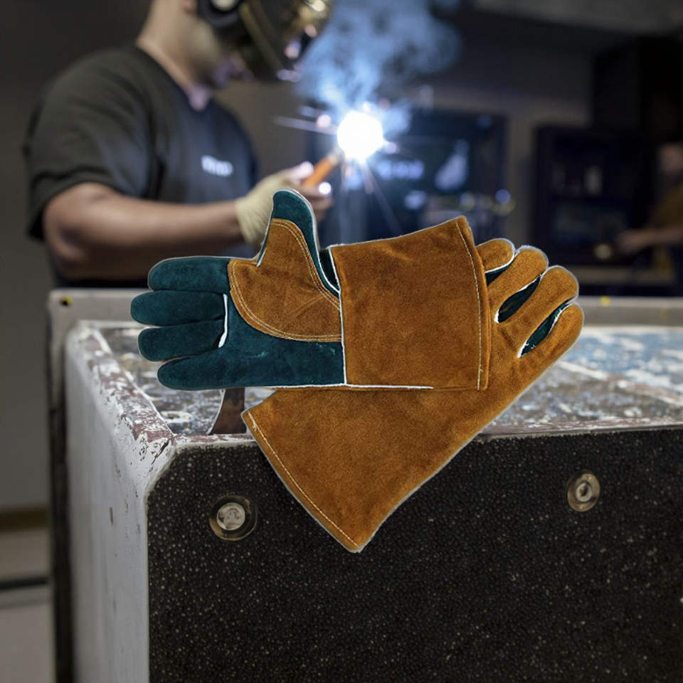 ถุงมือทำงานกันการฉีกขาดขนาด7ออนซ์16นิ้วสำหรับป้องกันงานเชื่อมอุตสาหกรรมทำจากหนังวัวปลอดภัยแบบคู่ดีไซน์ตามสั่ง