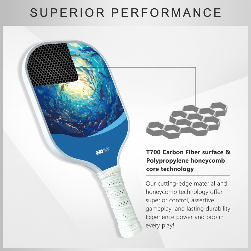 ไม้พายพิกเกิลบอลแบบพกพา คาร์บอนไฟเบอร์ ออกแบบเอง แกนรังผึ้งพิมพ์สี 16 มม. ได้รับการรับรองจาก USAPA สำหรับการเล่นเพื่อความบันเทิง