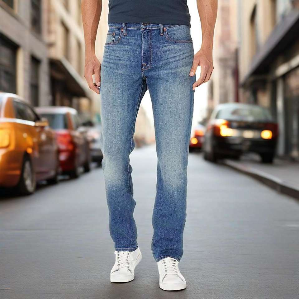 กางเกงยีนส์ผู้ชายทรงตรงสไตล์วินเทจซักด้วยหินคุณภาพสูงออกแบบได้ตามต้องการ
