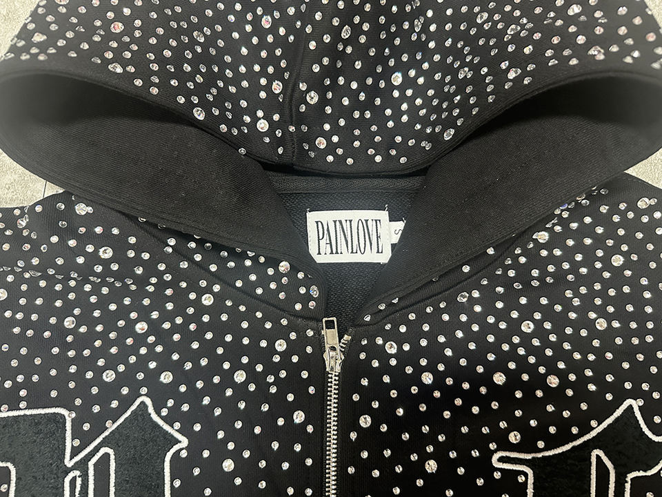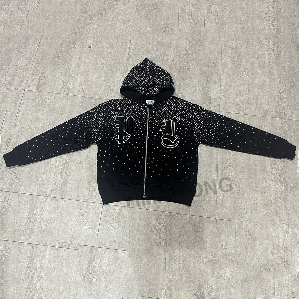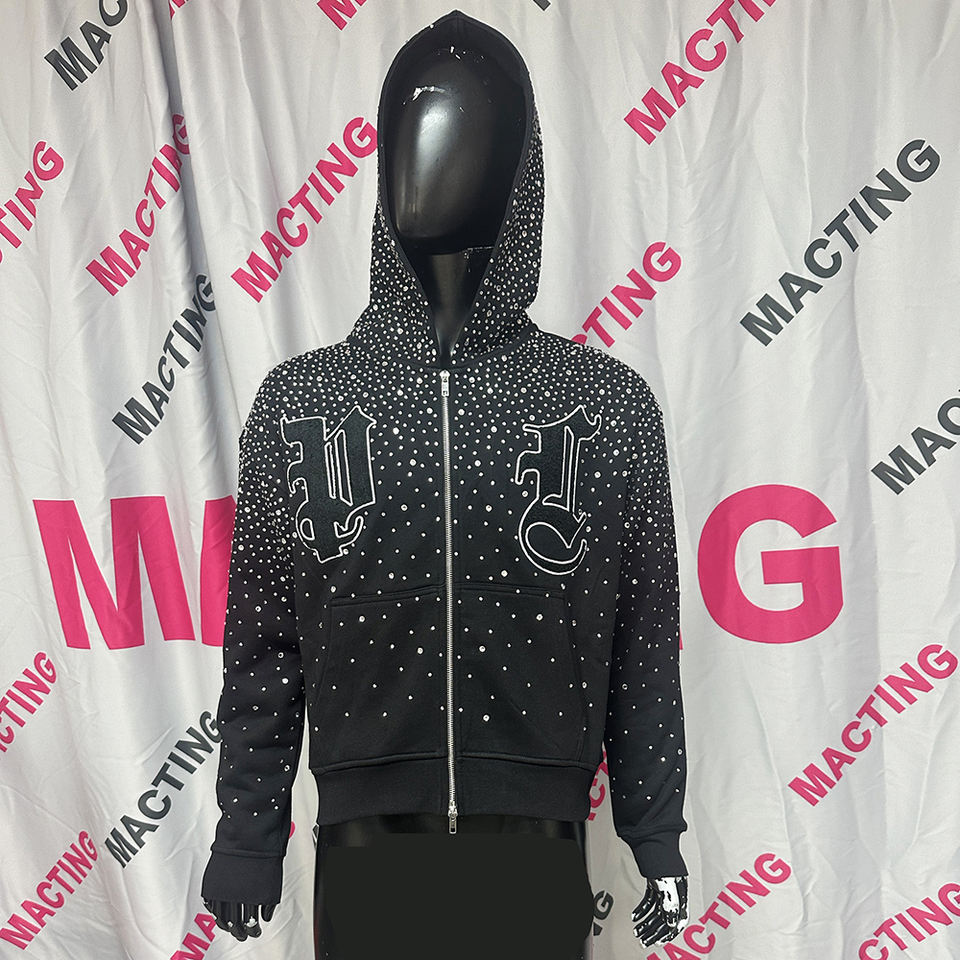 เสื้อมีฮู้ดแขนยาวมีซิปประดับด้วยพลอยเทียมประดับ420คริสตัลแกรมสำหรับนักออกแบบที่ออกแบบได้ตามต้องการ