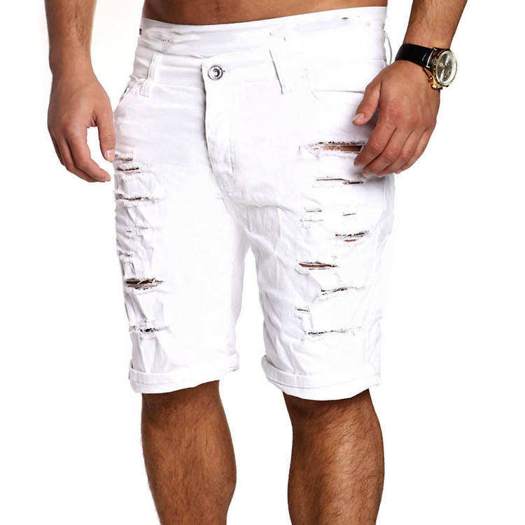 กางเกงยีนส์ขาสั้นผู้ชายสไตล์ลำลอง สีน้ำเงิน ดำ ขาว ขาดรุ่ย แต่งขอบ สำหรับฤดูร้อน