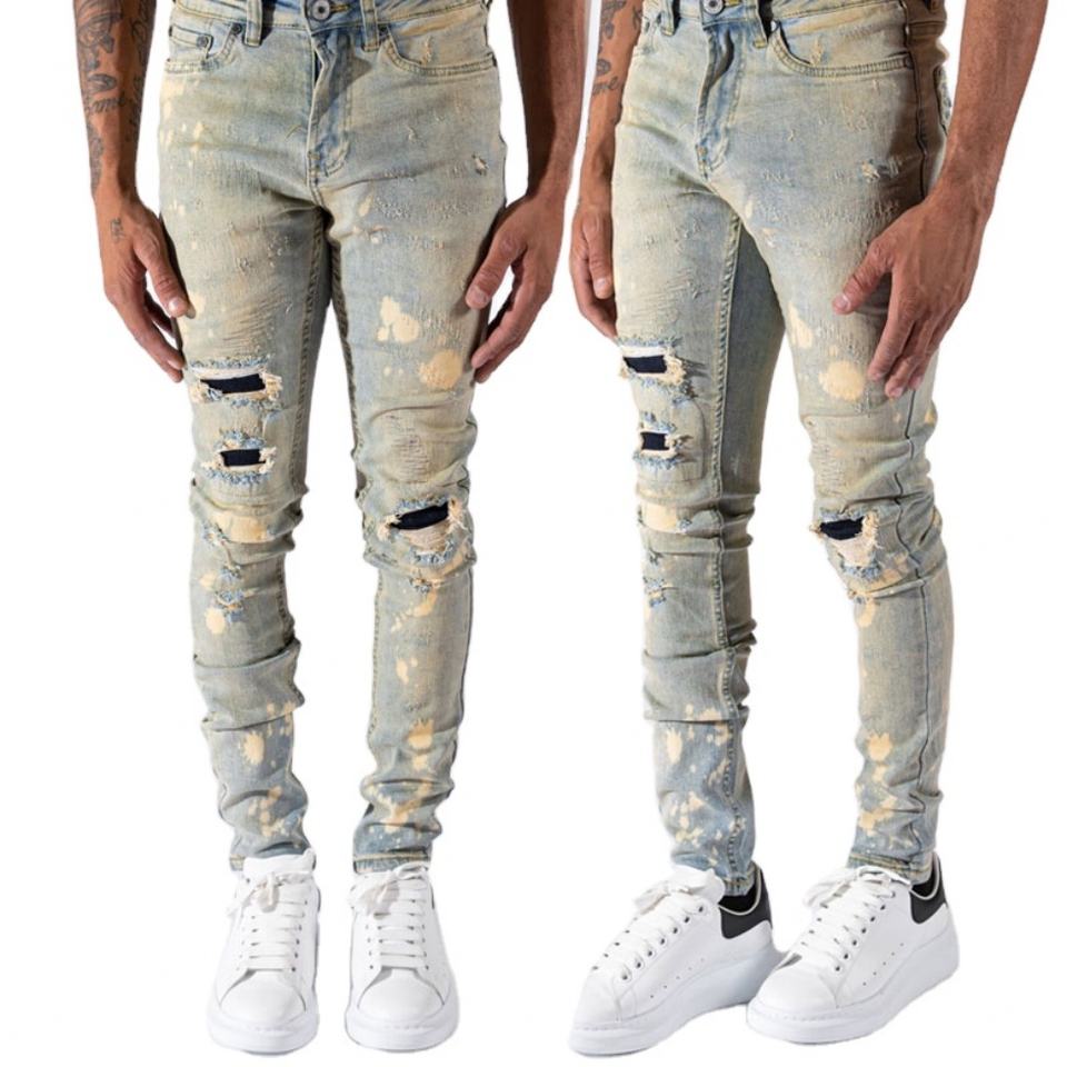 กางเกงยีนส์ผู้ชายทรงตรงเข้ารูปกางเกงทรงดินสอผ้านุ่มสำหรับผู้ชายมีรูยืดหยุ่นต่ำถูกทำลายออกแบบได้ตามต้องการ