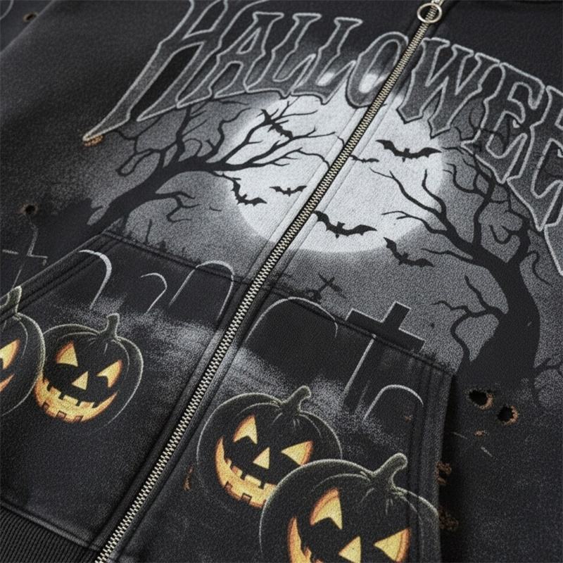 เสื้อฮู้ดฮาโลวีนใส่ได้ทั้งชายและหญิงเสื้อสเวตเตอร์ซักพิมพ์ลายดิจิตอลแบบมีซิปแนววินเทจเป็นมิตรกับสิ่งแวดล้อม