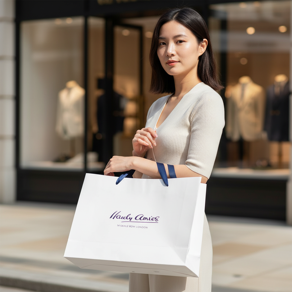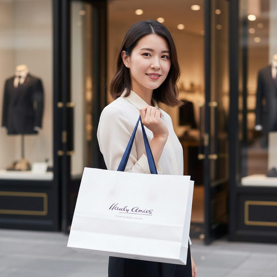 ถุงกระดาษช้อปปิ้งแบบใช้แล้วทิ้งสุดหรูเคลือบผิว ผลิตจากวัสดุรีไซเคิล พิมพ์โลโก้ เคลือบเงา พร้อมหูหิ้วแบบ Flexiloop สำหรับงานโปรโมชั่น
