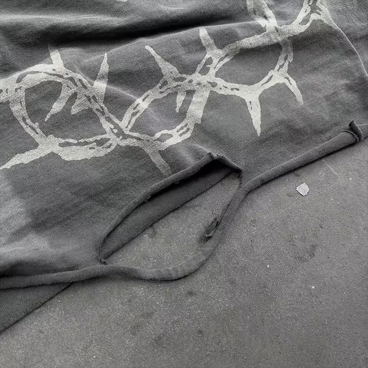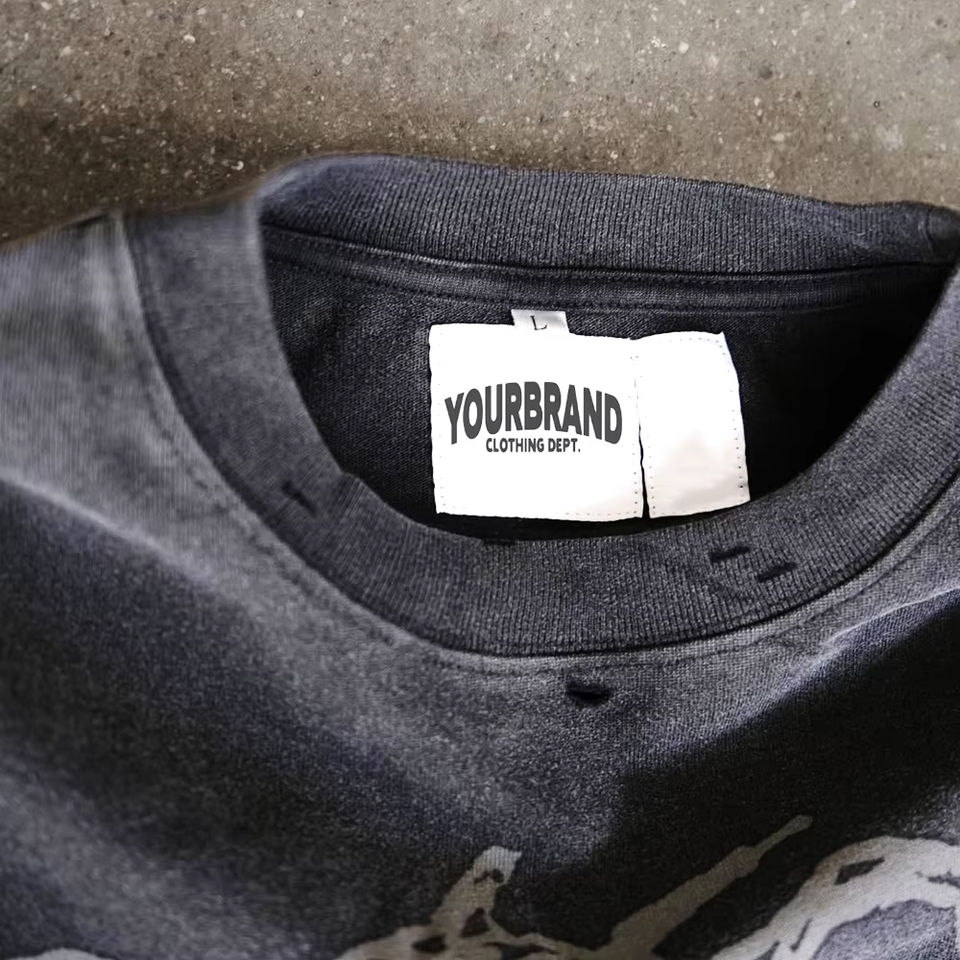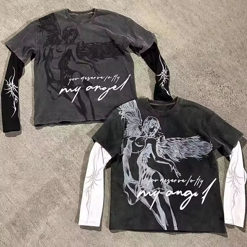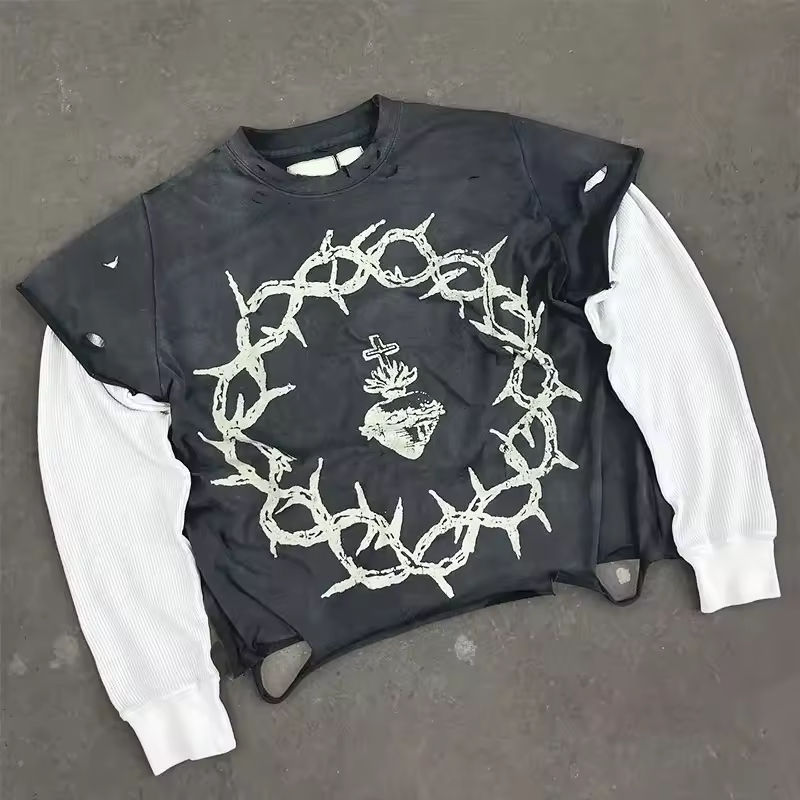 เสื้อยืดลายวินเทจสไตล์สตรีทแวร์สำหรับผู้ชาย แบบย้อมสีเอซิด ลุคขาดๆ ผ้าคอตตอน แบบสองชั้น แขนยาว ไม่มีแขน พร้อมลายพิมพ์ DTG