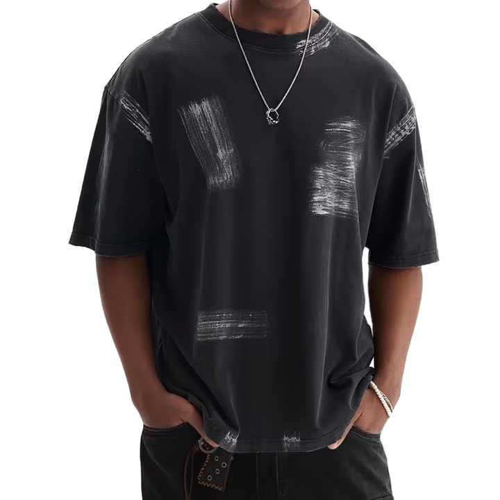 เสื้อยืดโอเวอร์ไซส์ผู้ชาย พิมพ์ลายโลโก้ด้านหน้าแบบดิสเทรส ผ้าคอตตอน 100% ผ้าถักกันยับ สีพื้น สไตล์ลำลอง แขนสั้น
