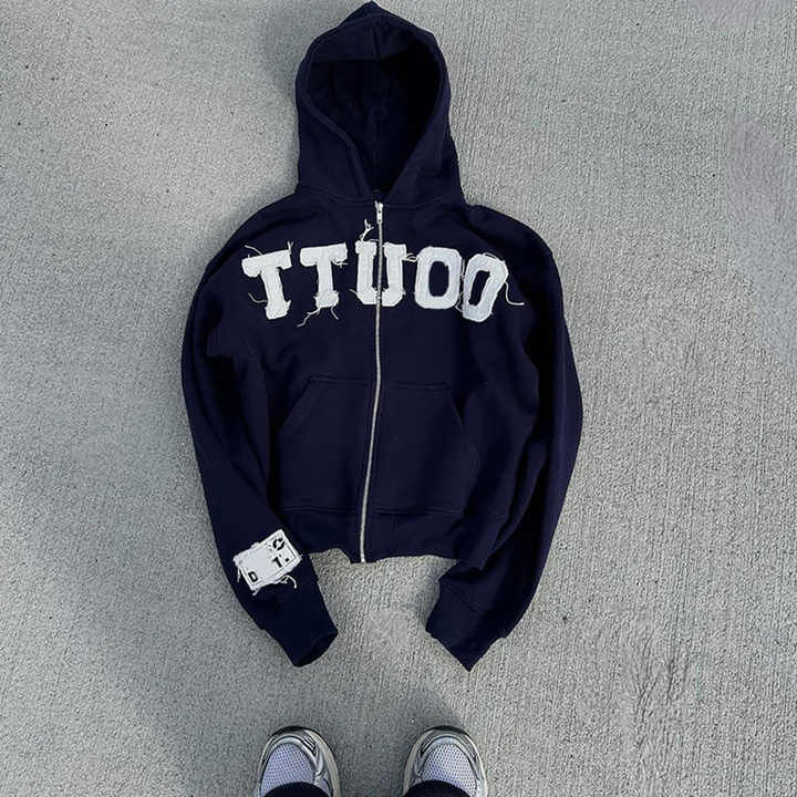 เสื้อฮู้ดดี้บุขนแกะซิปหน้าสำหรับผู้ชาย ผ้าฝ้าย 100% ตกแต่งด้วยแพทช์ปักลายแบบดิจิทัลสไตล์วินเทจสั่งทำพิเศษ