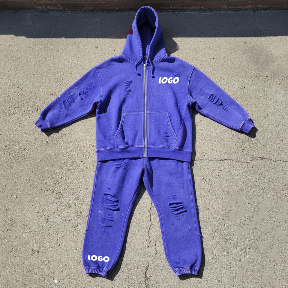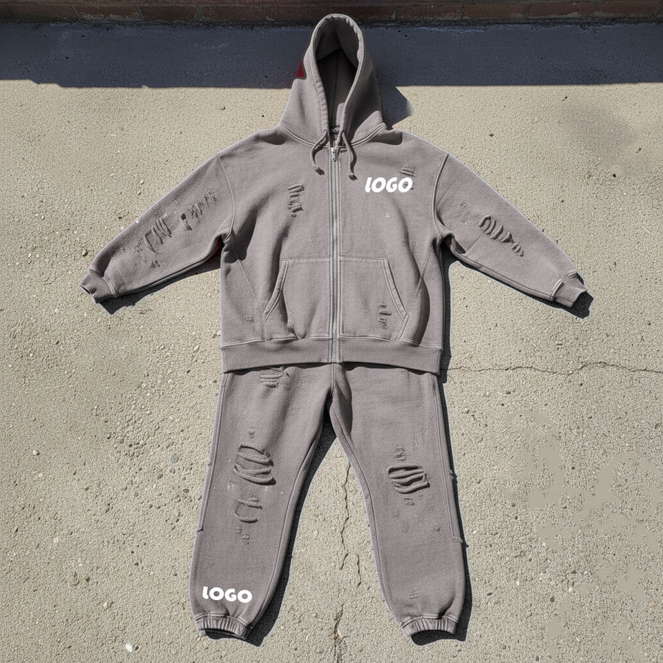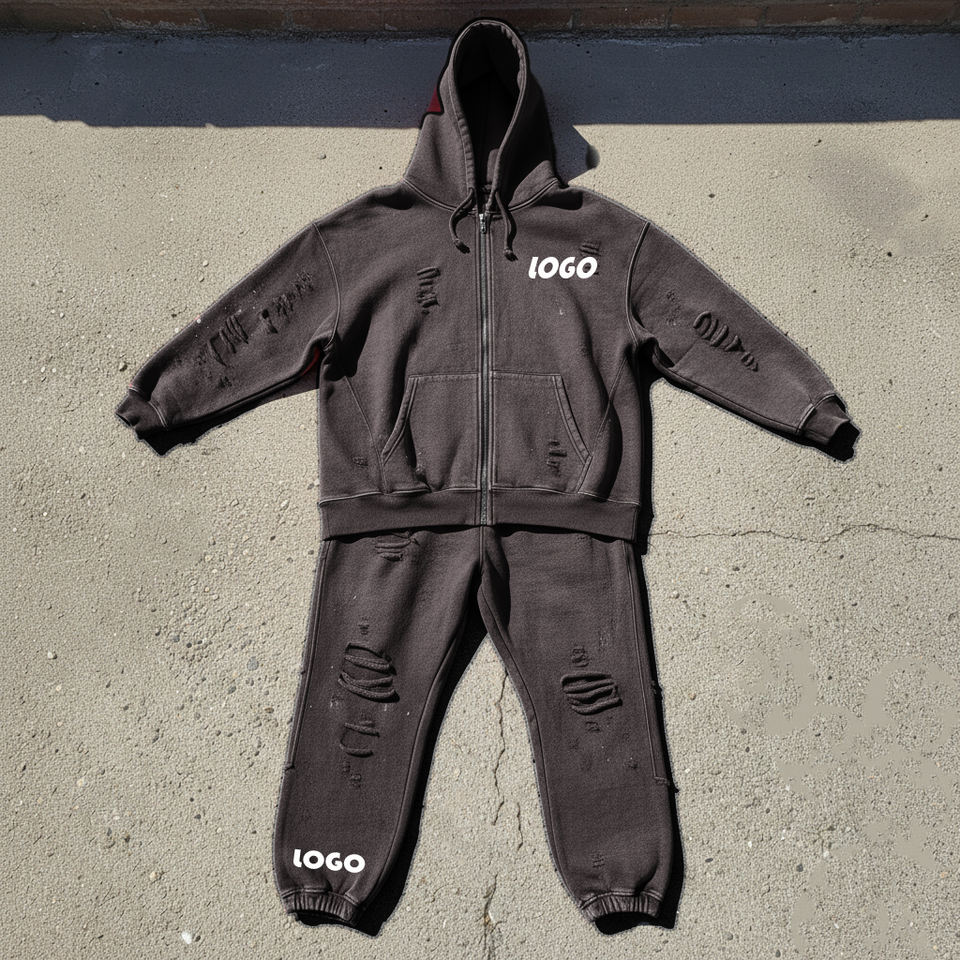 ชุดเซ็ตเสื้อฮู้ดซิปแต่งแพทช์สไตล์วินเทจ กางเกงวอร์มขาบานฟอกสีสไตล์ย้อนยุค พร้อมเสื้อฮู้ดสองชิ้นสำหรับผู้ชาย