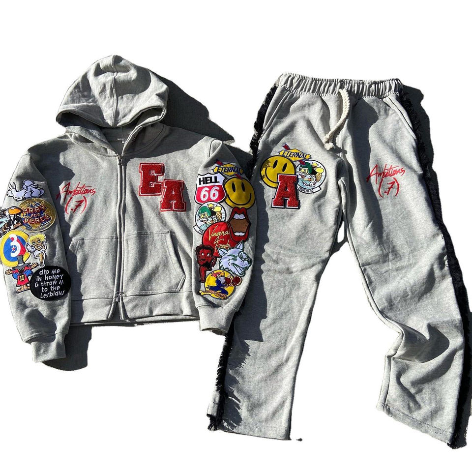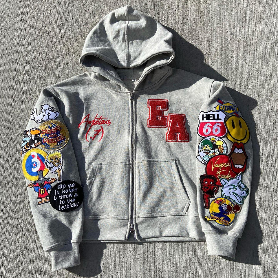 ชุดวอร์มปักลายวินเทจของผู้ชายชุดวอร์มเย็บปะติดแบบมีกรดมีซิปสำหรับฤดูหนาวลายพื้น