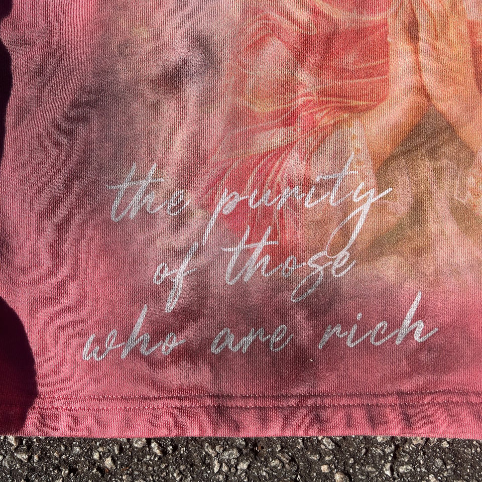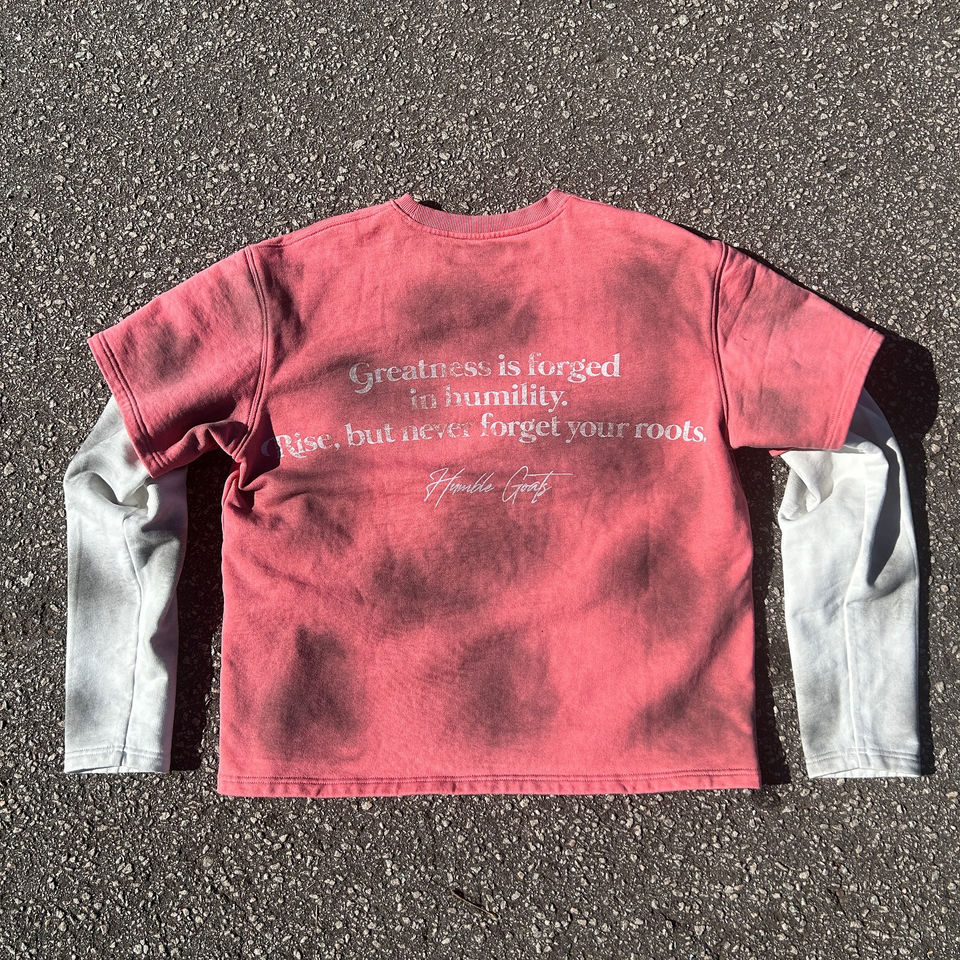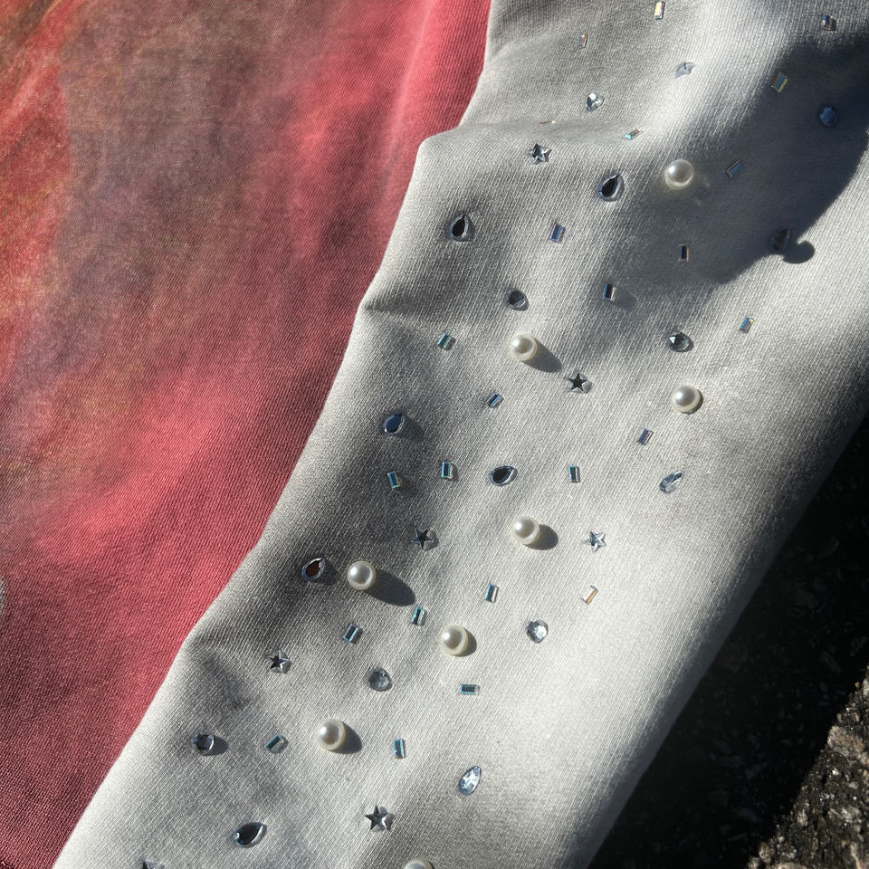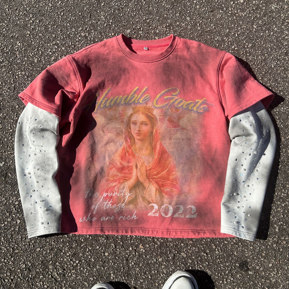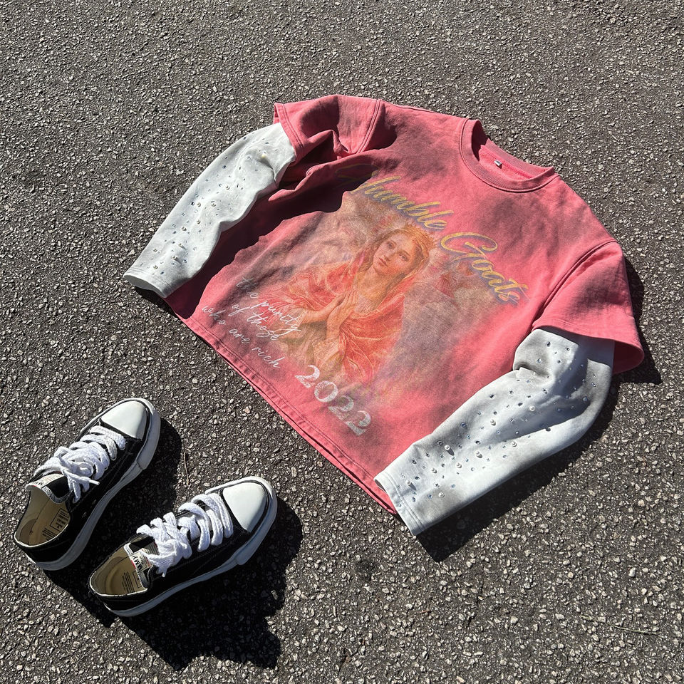 เสื้อยืดแขนยาวสองชั้นแบบสั่งทำพิเศษ ล้างสีแบบแอซิดวอช แต่งลายขาดๆ ประดับเพชรและตัวอักษรผ้าทอ จากโรงงานผู้ผลิตโดยตรง