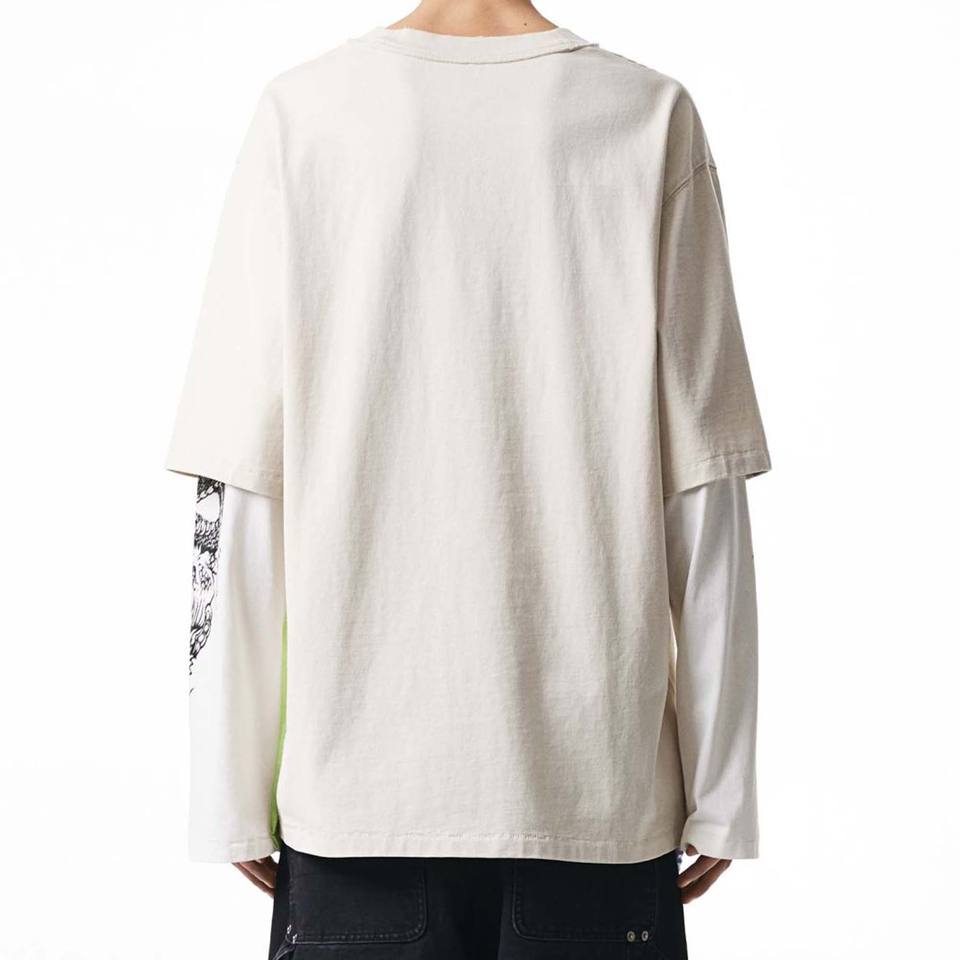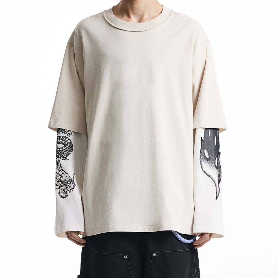 เสื้อยืดแขนยาวทรงโอเวอร์ไซส์ผู้ชายแบบสองชั้น แขนเสื้อแบบแร็กแลน ผ้าถักเนื้อหนัก 100% ผ้าฝ้าย