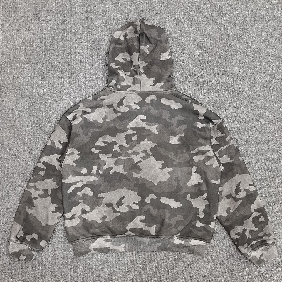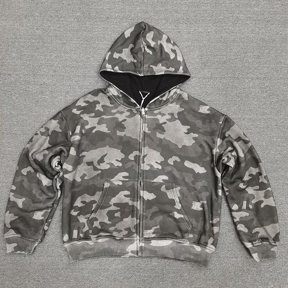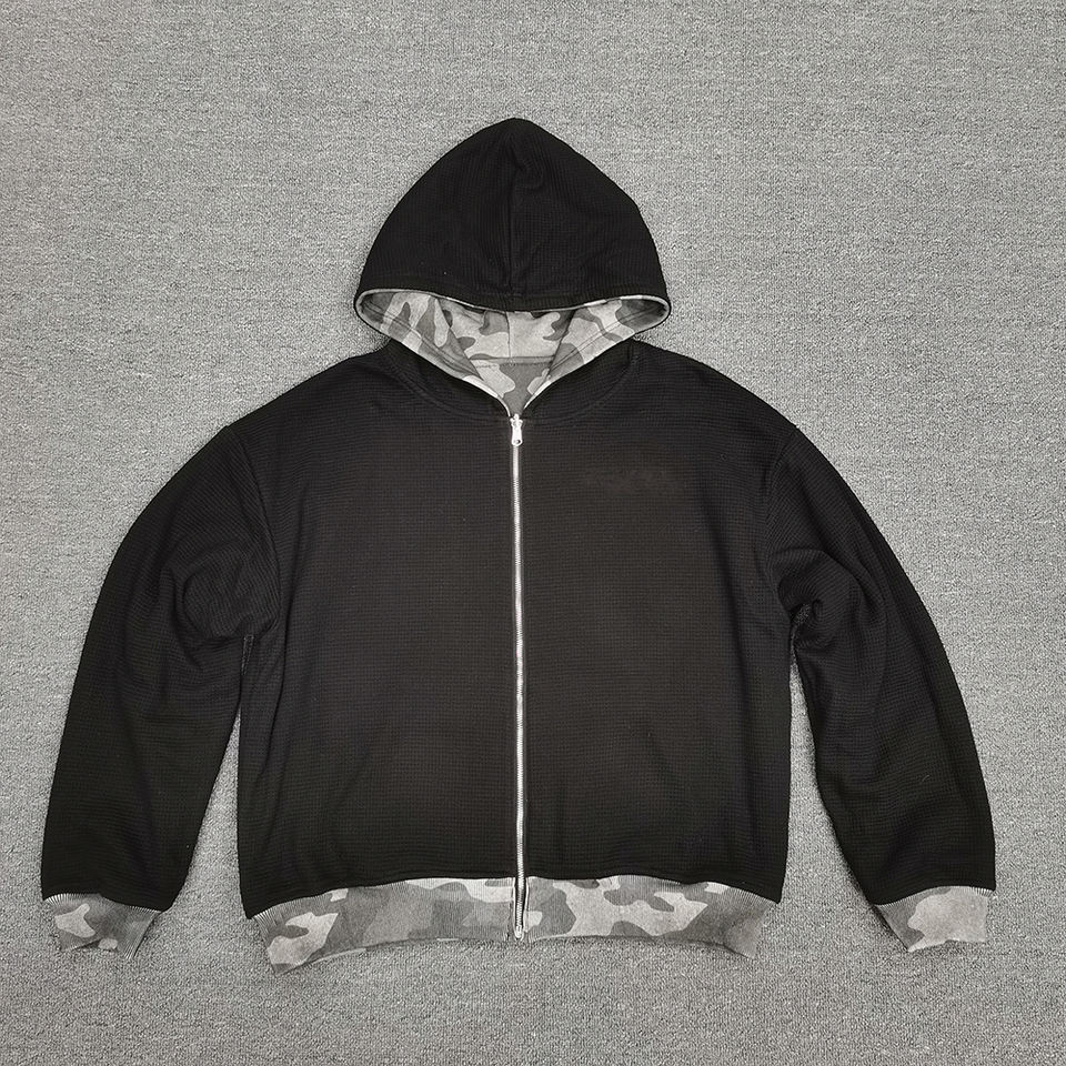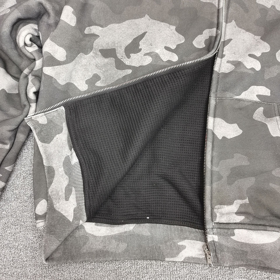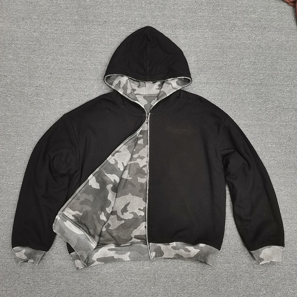เสื้อฮู้ดดี้ผู้ชายแบบครอปทรงบ็อกซี่ ผ้าวาฟเฟิลสองด้าน ลายพรางแบบกลับด้านได้ สองชั้น ผลิตตามสั่ง เป็นมิตรกับสิ่งแวดล้อม สไตล์วินเทจ สำหรับฤดูหนาว