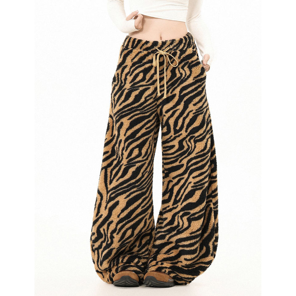 กางเกงคาร์โก้ขายาวทรงกว้างลายเสือดาวอเมริกันย้อนยุคบุขนสองด้านแบบกำหนดเองสำหรับผู้ชายและผู้หญิง