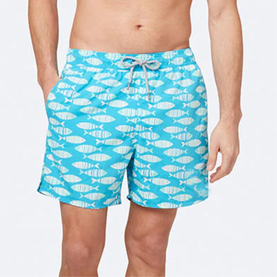 กางเกงว่ายน้ำแบบผูกเชือกสำหรับผู้ชายกางเกงขาสั้นชายหาดผ้าโพลีเอสเตอร์แห้งเร็วเอวยางยืดเป็นมิตรต่อสิ่งแวดล้อมพิมพ์ลายมีซิป