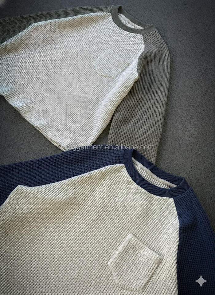 เสื้อสเวตเชิ้ตแขนยาวลายกราฟิกแบบพิมพ์ลาย DTG ตัดต่อผ้าแบบแพทช์เวิร์ค ผ้าวาฟเฟิล แขนเสื้อแบบแร็กแลน เสื้อยืดสตรีทแวร์แบบกันหนาว