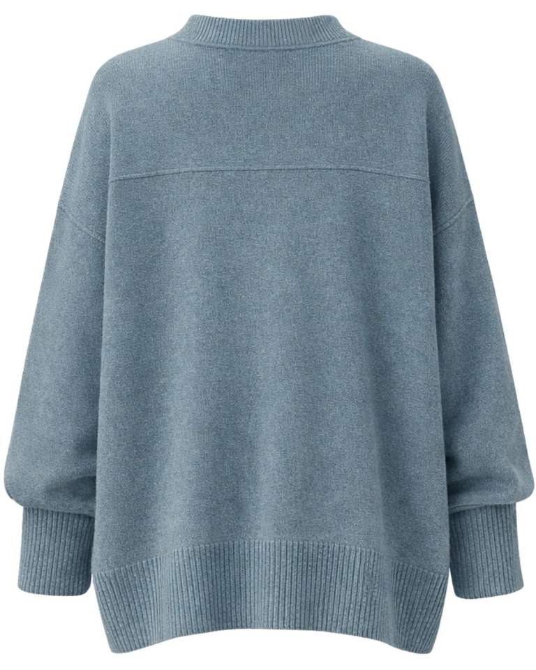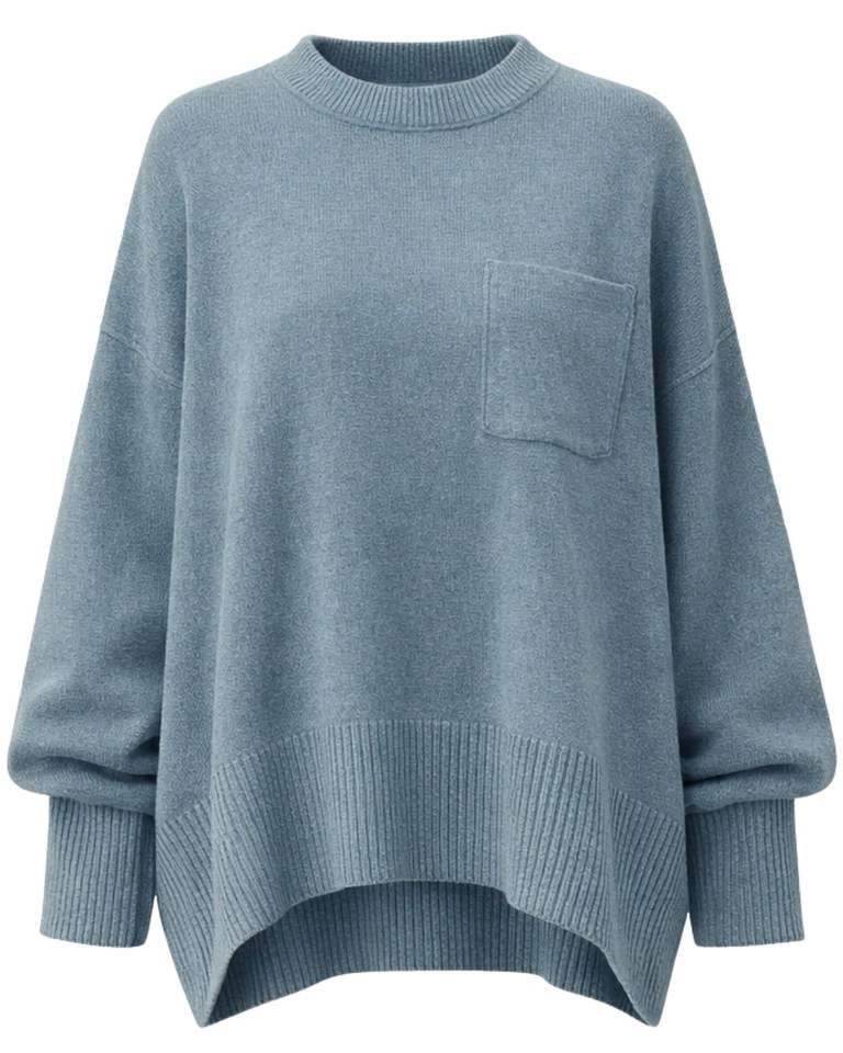 เสื้อสเวตเตอร์ไหมพรมสีฟ้าอมเทาแบบโอเวอร์ไซส์สำหรับผู้หญิง ทรงหลวม ไหล่ตก คอกลม มีกระเป๋า สไตล์นุ่มสบาย เหมาะสำหรับฤดูหนาว แฟชั่นลำลอง