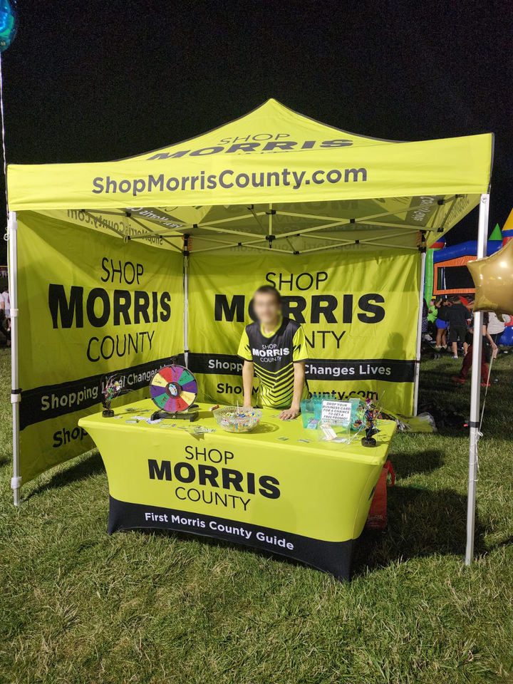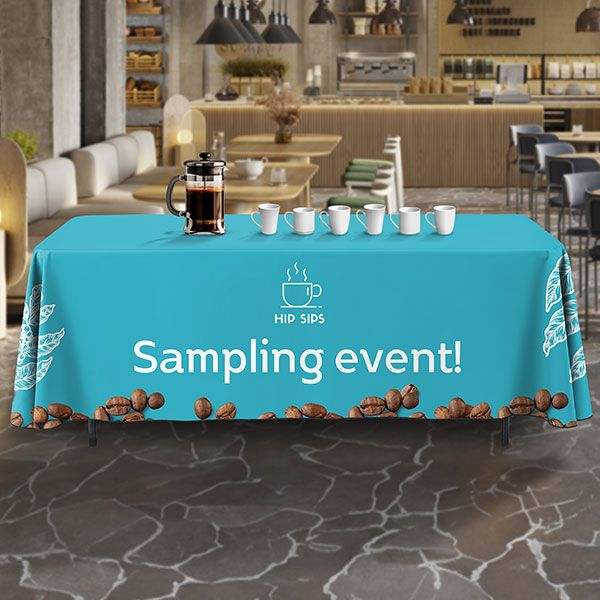 ผ้าคลุมโต๊ะพิมพ์ลายโลโก้ด้วยเทคนิค Dye Sublimation สำหรับงานแสดงสินค้า ผลิตจากโพลีเอสเตอร์กันน้ำ ยืดหยุ่นได้ดี พร้อมผ้าสแปนเด็กซ์