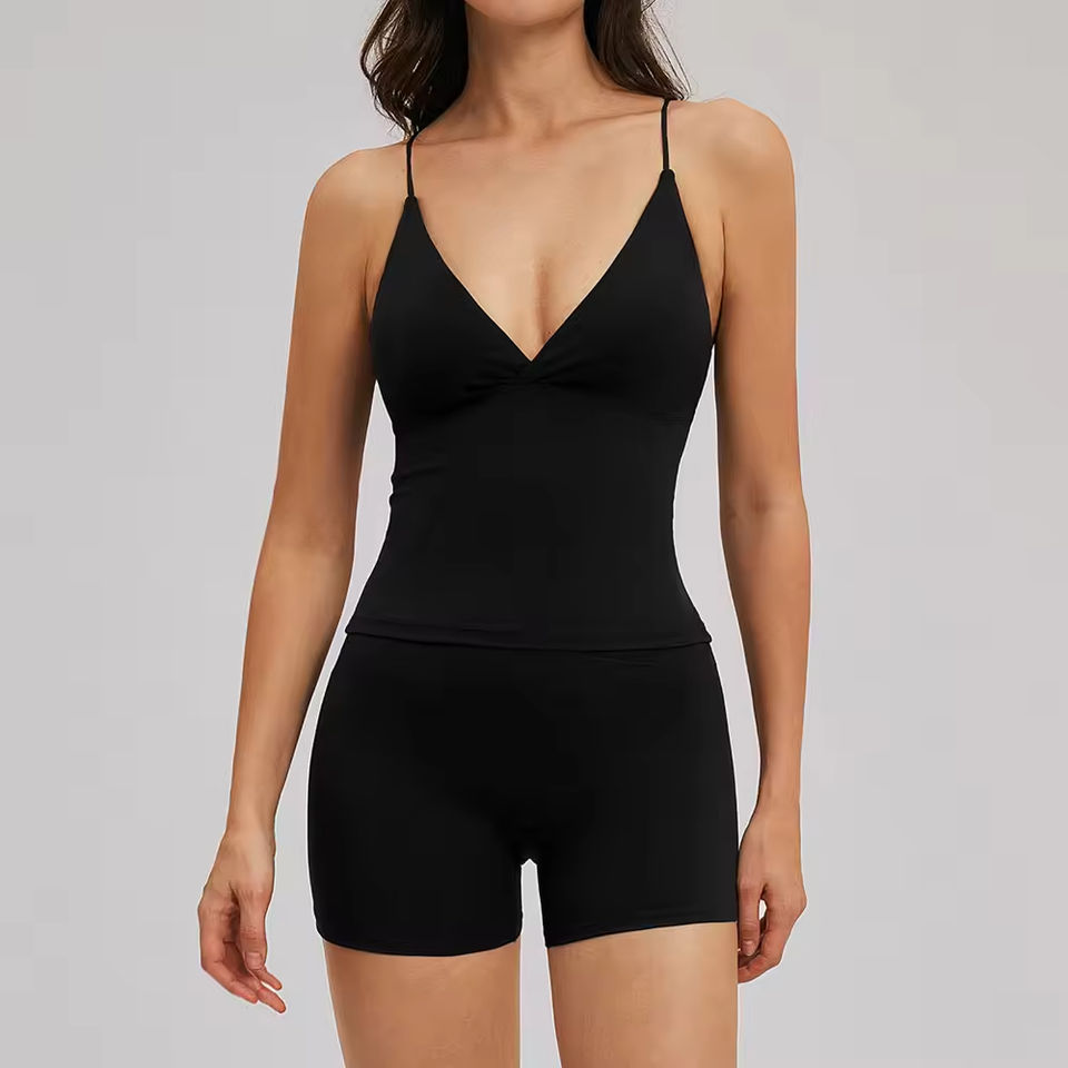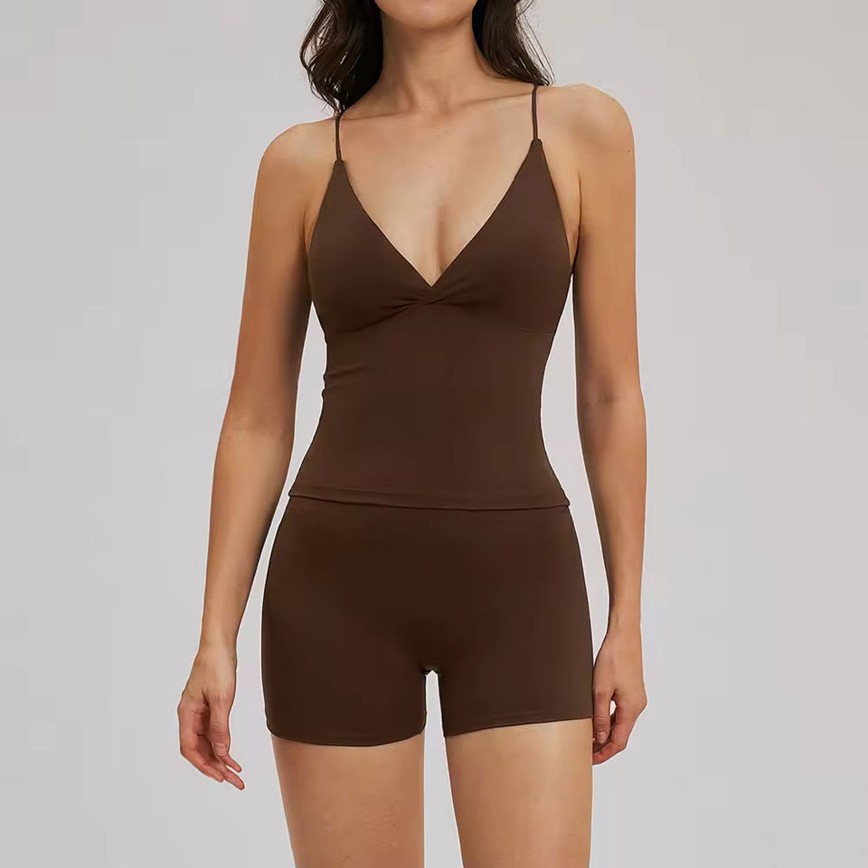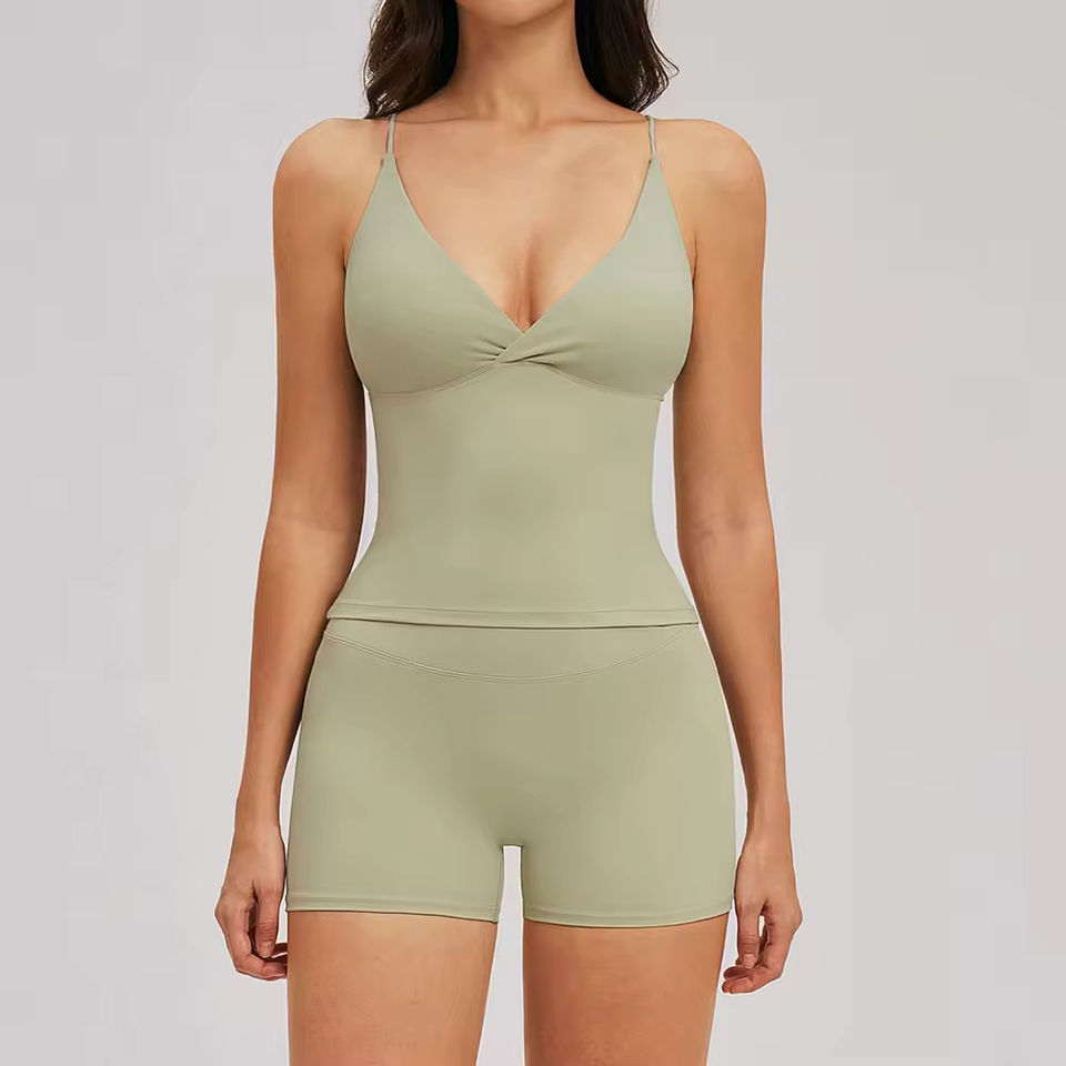 ชุดโยคะ เสื้อกล้ามออกกำลังกายแบบไร้สายรัดหลัง ยืดหยุ่นสูง เป็นมิตรกับสิ่งแวดล้อม ผลิตจากวัสดุรีไซเคิล พร้อมกางเกงขาสั้นเอววีสำหรับออกกำลังกายและโยคะ